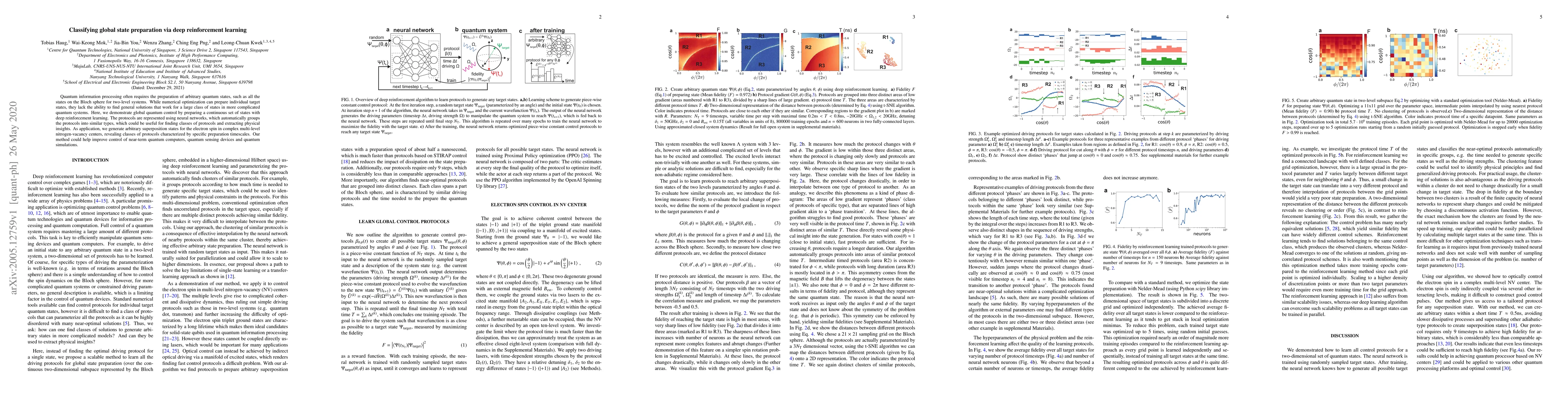 This paper demonstrates the use of deep reinforcement learning to prepare a continuous set of quantum states globally, employing neural networks to identify classes of protocols. The method successfully generates arbitrary superposition states for electron spins in multi-level nitrogen-vacancy centers, potentially enhancing control in near-term quantum computers and devices.