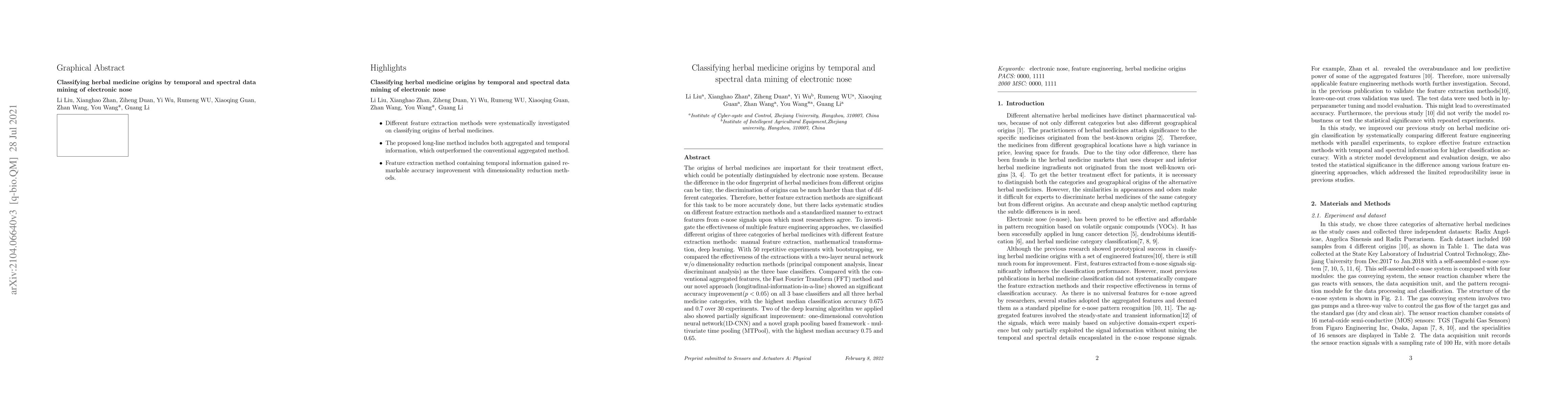 This study explores the classification of herbal medicine origins using an electronic nose system, employing various feature extraction methods including manual extraction, mathematical transformations, and deep learning. Results show significant accuracy improvements with Fast Fourier Transform and a novel longitudinal-information-in-a-line approach, as well as partial improvements from 1D-CNN and multivariate time pooling.