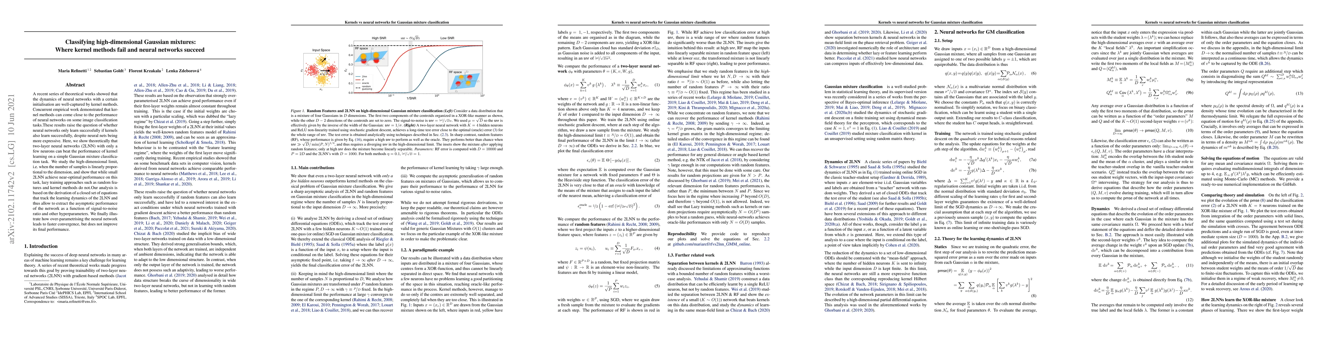 This paper demonstrates that two-layer neural networks outperform kernel methods in classifying high-dimensional Gaussian mixtures, especially when the number of samples scales linearly with input dimensions. It shows that while small neural networks achieve near-optimal performance, kernel methods fail to do so, despite theoretical parallels between neural networks and kernel methods.