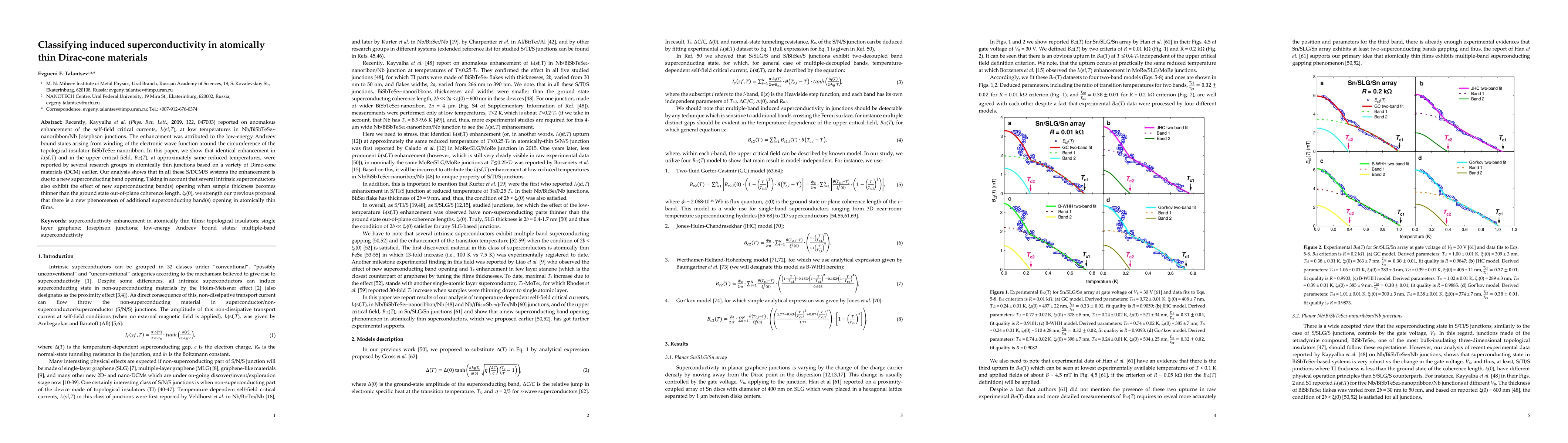 Recently, Kayyalha et al. (2019 Phys. Rev. Lett. 122 047003) reported on anomalous enhancement of the self-field critical currents, Ic(sf,T), at low temperatures in Nb/BiSbTeSe2-nanoribbon/Nb Josephson junctions. The enhancement was attributed to the low-energy Andreev bound states arising from winding of the electronic wave function around the circumference of the topological insulator BiSbTeSe2 nanoribbon. In this paper, we show that identical enhancement in Ic(sf,T) and in the upper critical field, Bc2(T), at approximately same reduced temperatures, were reported by several research groups in atomically thin junctions based on a variety of Dirac-cone materials (DCM) earlier. Our analysis shows that in all these S/DCM/S systems the enhancement is due to a new superconducting band opening. Taking in account that several intrinsic superconductors also exhibit the effect of new superconducting band(s) opening when sample thickness becomes thinner than the ground state out-of-plane coherence length, we strength our previous proposal that there is a new phenomenon of additional superconducting band(s) opening in atomically thin films.