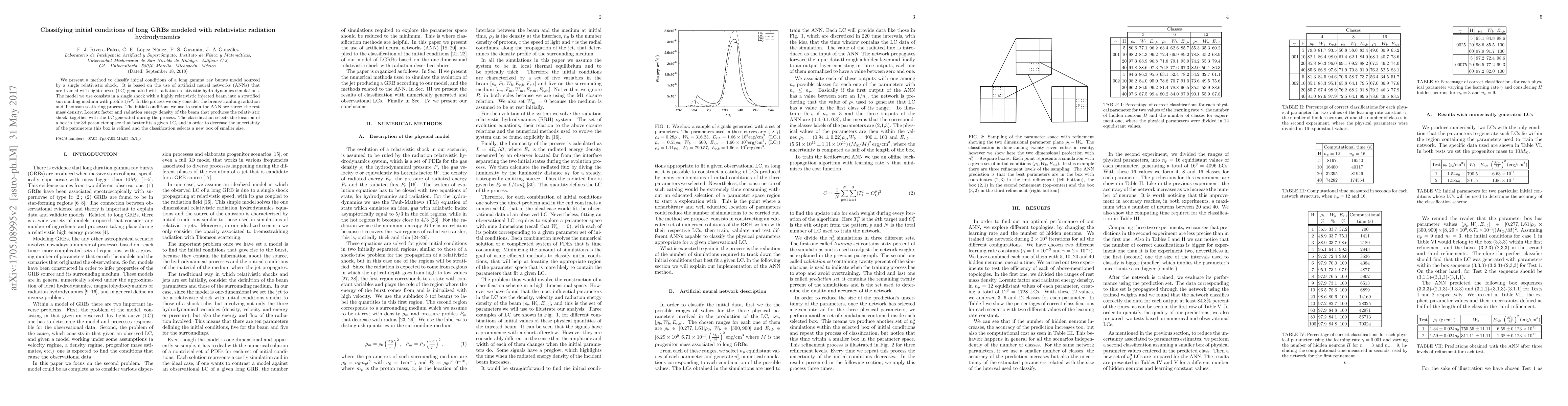 This paper proposes a method using artificial neural networks to classify initial conditions for long gamma-ray bursts (GRBs) modeled by relativistic radiation hydrodynamics. The trained ANNs analyze light curves generated from simulations, focusing on the parameters of the relativistic shock's beam, to refine the classification in a 3D parameter space.