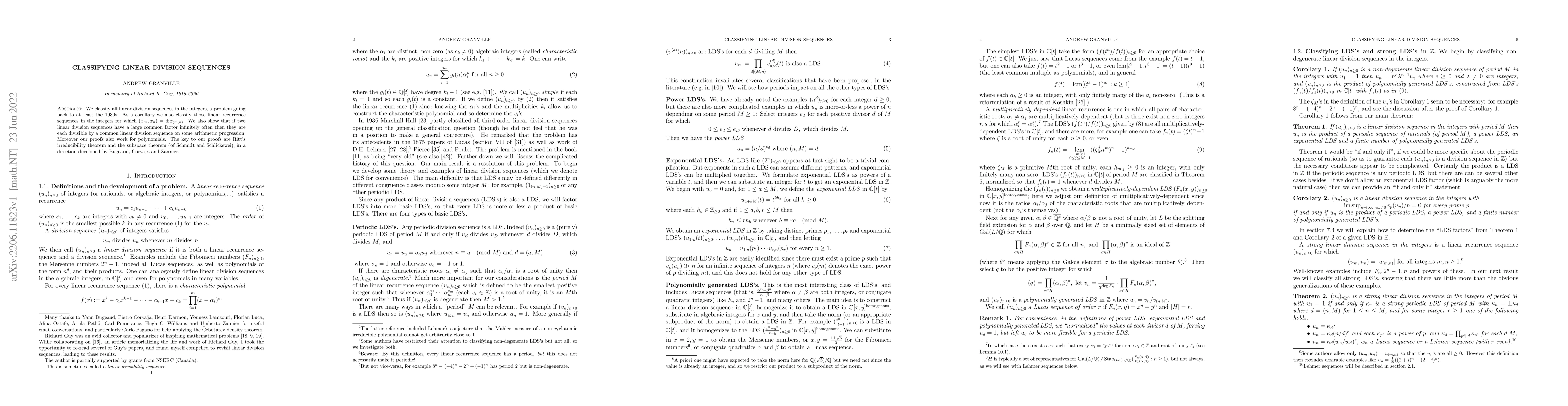 This paper classifies all linear division sequences in the integers, utilizing Ritt's irreducibility theorem and the subspace theorem, and extends the classification to linear recurrence sequences with specific properties. It also demonstrates that large common factors between two such sequences imply divisibility by a common linear division sequence on some arithmetic progression.