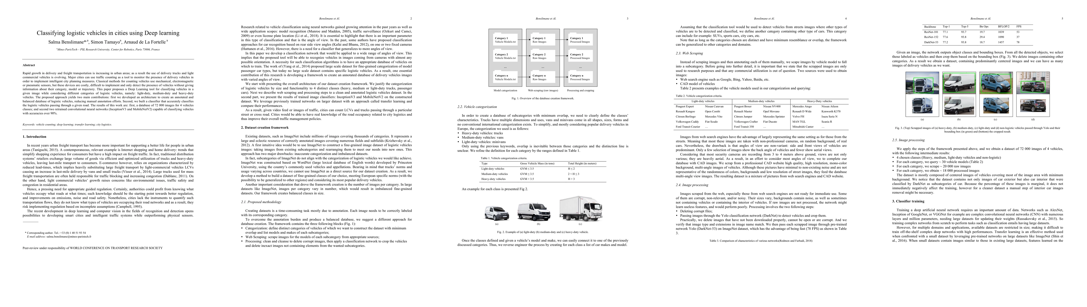 Rapid growth in delivery and freight transportation is increasing in urban areas; as a result the use of delivery trucks and light commercial vehicles is evolving. Major cities can use traffic counting as a tool to monitor the presence of delivery vehicles in order to implement intelligent city planning measures. Classical methods for counting vehicles use mechanical, electromagnetic or pneumatic sensors, but these devices are costly, difficult to implement and only detect the presence of vehicles without giving information about their category, model or trajectory. This paper proposes a Deep Learning tool for classifying vehicles in a given image while considering different categories of logistic vehicles, namely: light-duty, medium-duty and heavy-duty vehicles. The proposed approach yields two main contributions: first we developed an architecture to create an annotated and balanced database of logistic vehicles, reducing manual annotation efforts. Second, we built a classifier that accurately classifies the logistic vehicles passing through a given road. The results of this work are: first, a database of 72 000 images for 4 vehicles classes; and second two retrained convolutional neural networks (InceptionV3 and MobileNetV2) capable of classifying vehicles with accuracies over 90%.