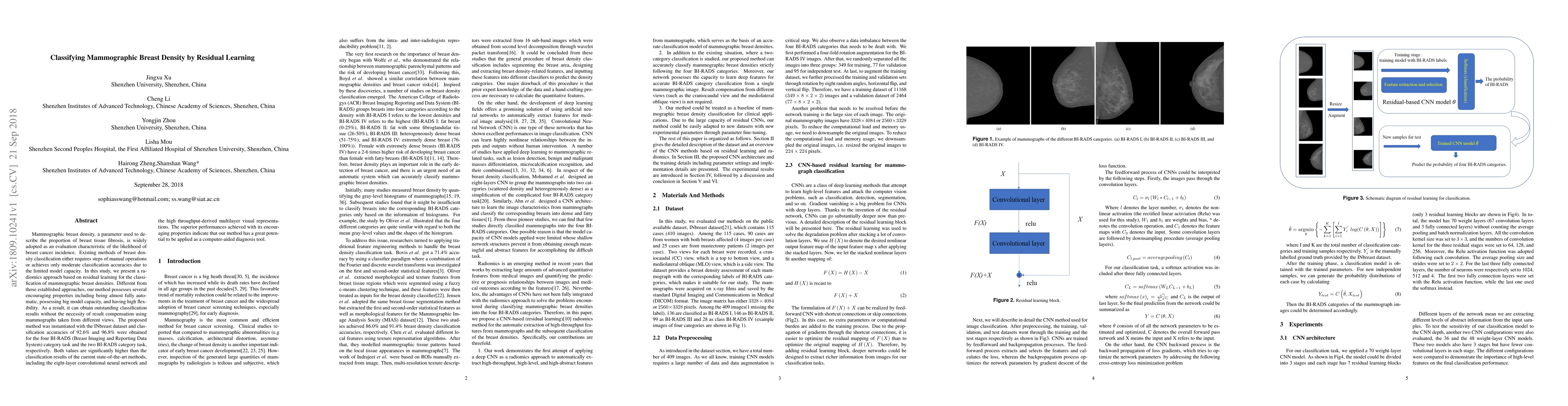 This paper proposes a radiomics approach based on residual learning to classify mammographic breast density, achieving high classification accuracies of 92.6% and 96.8% for four and two BI-RADS categories respectively. The method's automatic nature and flexibility suggest it has potential as a computer-aided diagnosis tool.