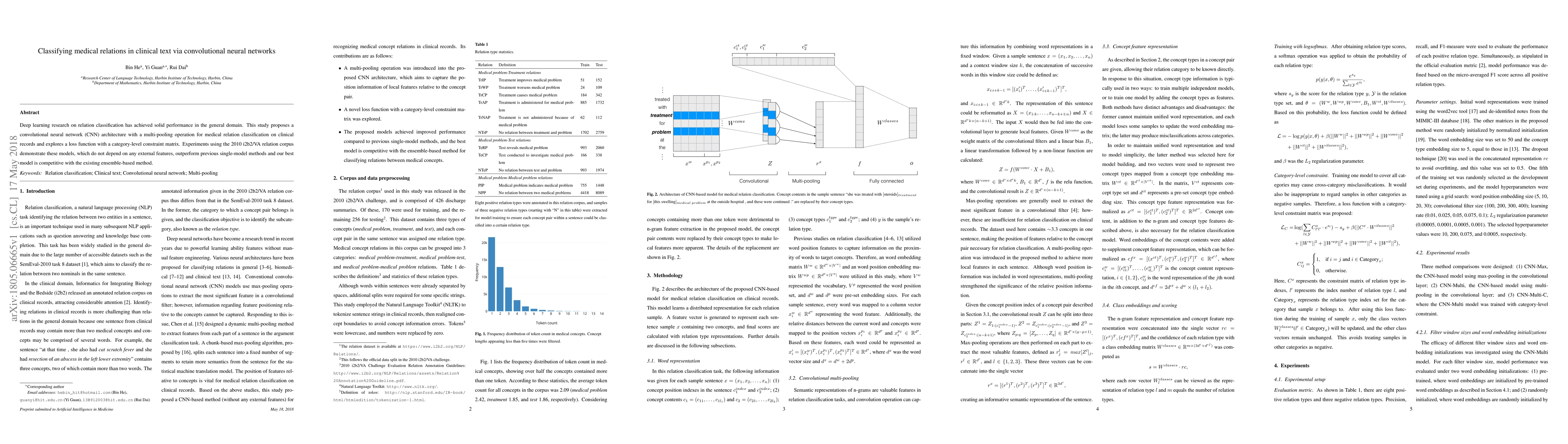 Deep learning research on relation classification has achieved solid performance in the general domain. This study proposes a convolutional neural network (CNN) architecture with a multi-pooling operation for medical relation classification on clinical records and explores a loss function with a category-level constraint matrix. Experiments using the 2010 i2b2/VA relation corpus demonstrate these models, which do not depend on any external features, outperform previous single-model methods and our best model is competitive with the existing ensemble-based method.