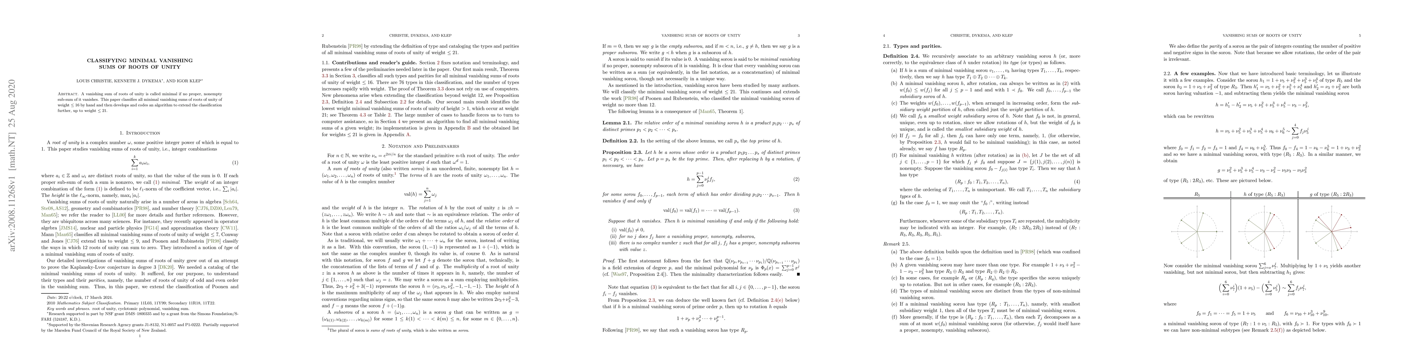This paper classifies minimal vanishing sums of roots of unity up to weight 16 manually and extends the classification algorithmically up to weight 21, providing a comprehensive overview of these mathematical constructs.