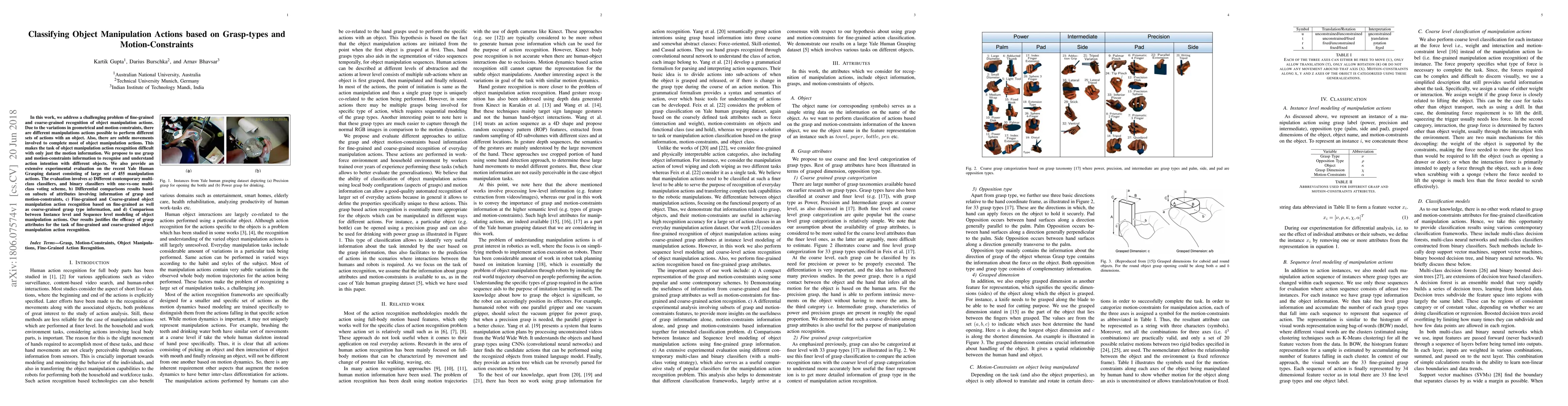 This paper proposes a method to classify object manipulation actions using grasp-types and motion-constraints, addressing the difficulty of recognizing actions based solely on motion. Experimental results on the Yale Human Grasping dataset demonstrate the effectiveness of grasp attributes for fine-grained and coarse-grained action recognition.