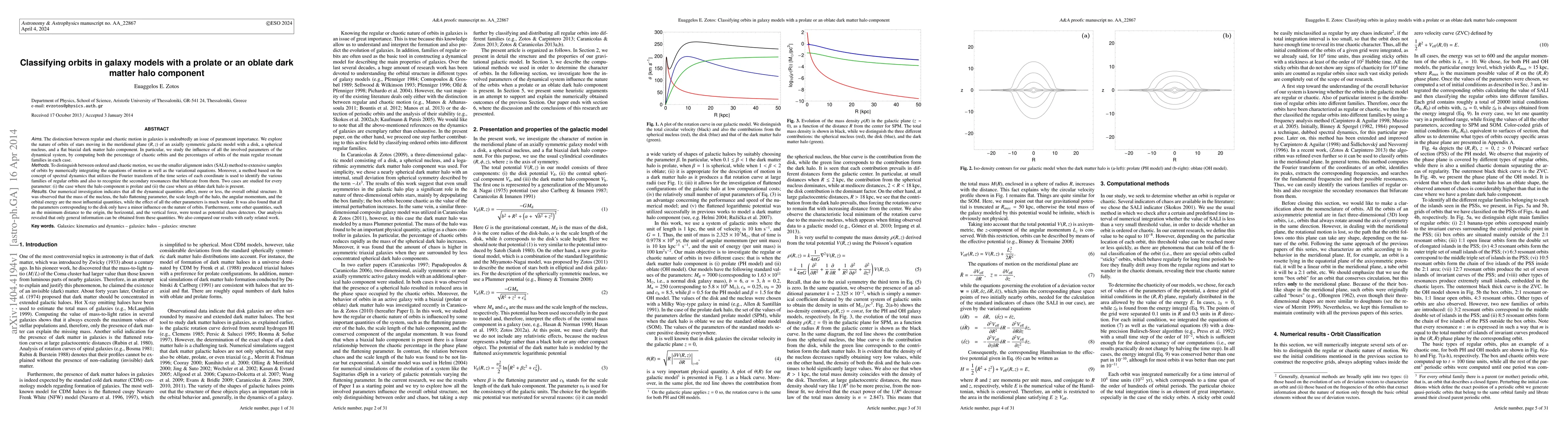 This paper investigates the classification of star orbits in galactic models with either prolate or oblate dark matter halos, analyzing the influence of various parameters on orbital dynamics. The study employs numerical integration and spectral dynamics methods to identify chaotic and regular orbits, revealing that the mass of the nucleus and halo properties are the most significant factors affecting orbital behavior.