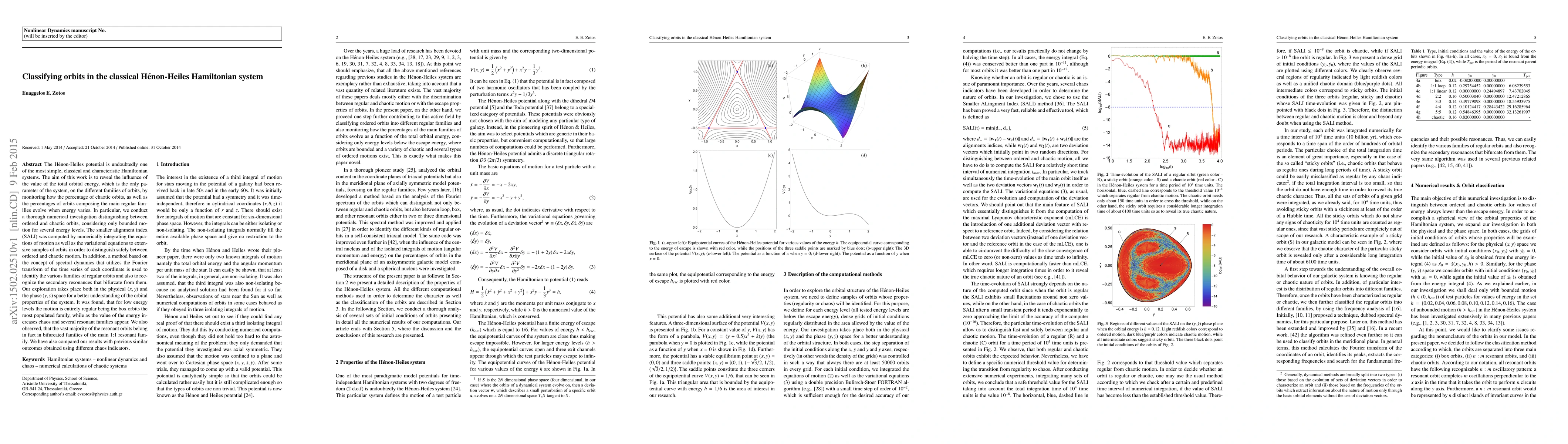 This paper investigates the Hénon-Heiles Hamiltonian system, focusing on how varying total orbital energy influences the classification of orbits into regular and chaotic families. Through numerical analysis using the smaller alignment index and spectral dynamics, it reveals that low energy levels predominantly feature regular box orbits, while higher energy levels introduce chaos and resonant families, with most resonant orbits originating from bifurcations of the main 1:1 resonant family.