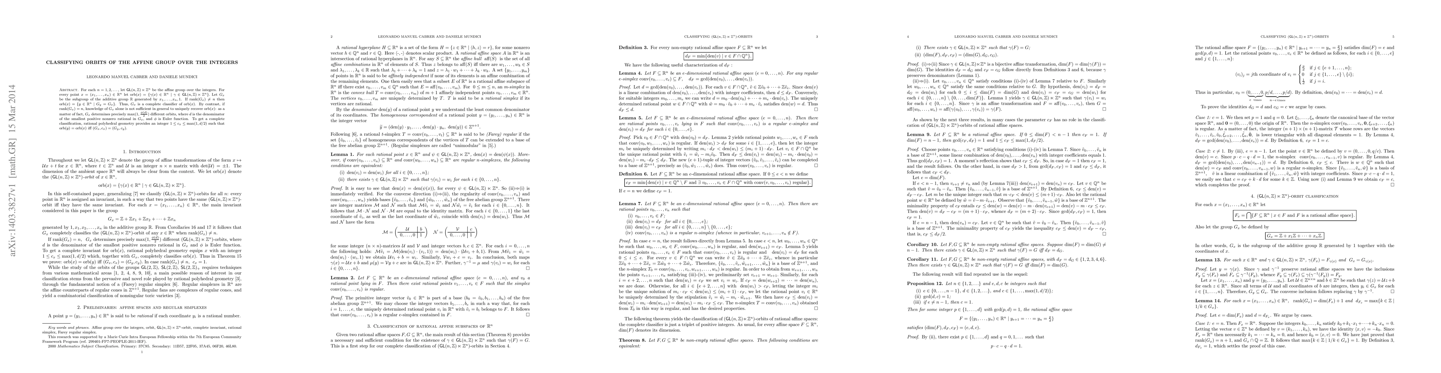 This paper classifies the orbits of the affine group over the integers, showing that the subgroup generated by the coordinates of a point and 1, $G_x$, determines the orbit if its rank is less than $n$. When the rank equals $n$, $G_x$ only determines part of the orbit, requiring additional rational polyhedral geometry to fully classify the orbit.