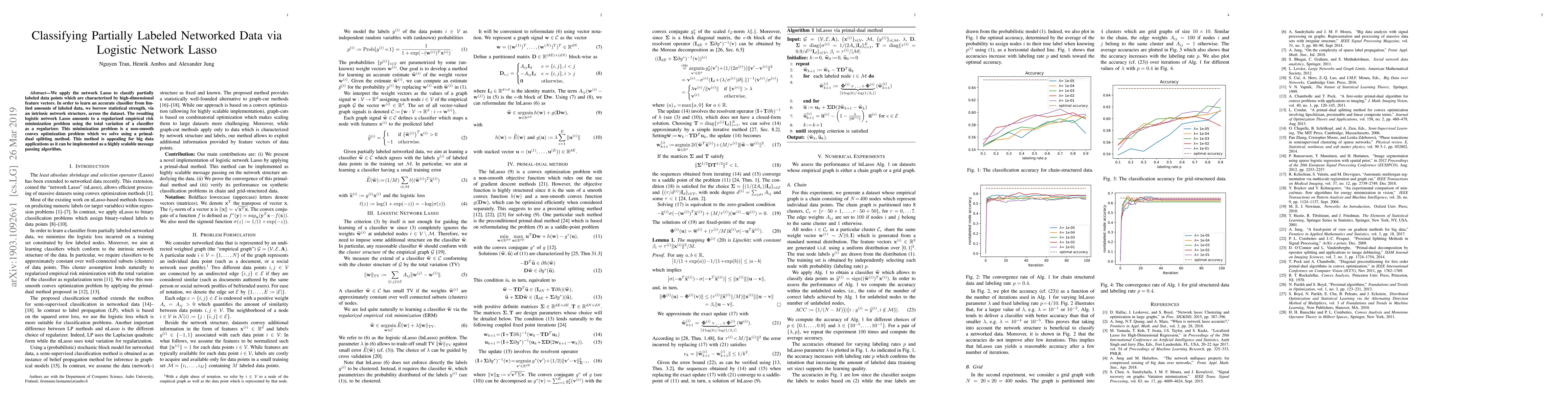 We apply the network Lasso to classify partially labeled data points which are characterized by high-dimensional feature vectors. In order to learn an accurate classifier from limited amounts of labeled data, we borrow statistical strength, via an intrinsic network structure, across the dataset. The resulting logistic network Lasso amounts to a regularized empirical risk minimization problem using the total variation of a classifier as a regularizer. This minimization problem is a non-smooth convex optimization problem which we solve using a primal-dual splitting method. This method is appealing for big data applications as it can be implemented as a highly scalable message passing algorithm.