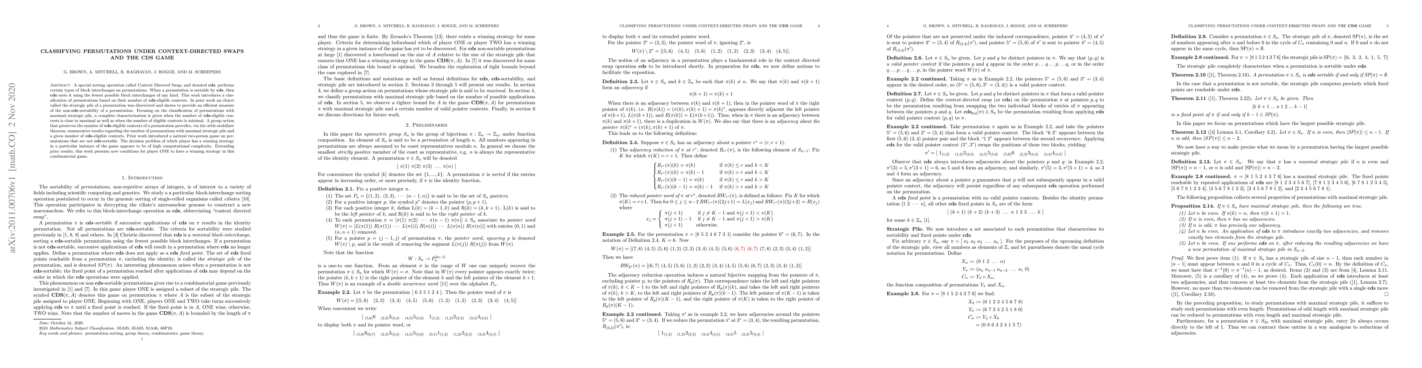 A special sorting operation called Context Directed Swap, and denoted \textbf{cds}, performs certain types of block interchanges on permutations. When a permutation is sortable by \textbf{cds}, then \textbf{cds} sorts it using the fewest possible block interchanges of any kind. This work introduces a classification of permutations based on their number of \textbf{cds}-eligible contexts. In prior work an object called the strategic pile of a permutation was discovered and shown to provide an efficient measure of the non-\textbf{cds}-sortability of a permutation. Focusing on the classification of permutations with maximal strategic pile, a complete characterization is given when the number of \textbf{cds}-eligible contexts is close to maximal as well as when the number of eligible contexts is minimal. A group action that preserves the number of \textbf{cds}-eligible contexts of a permutation provides, via the orbit-stabilizer theorem, enumerative results regarding the number of permutations with maximal strategic pile and a given number of \textbf{cds}-eligible contexts. Prior work introduced a natural two-person game on permutations that are not \textbf{cds}-sortable. The decision problem of which player has a winning strategy in a particular instance of the game appears to be of high computational complexity. Extending prior results, this work presents new conditions for player ONE to have a winning strategy in this combinatorial game.