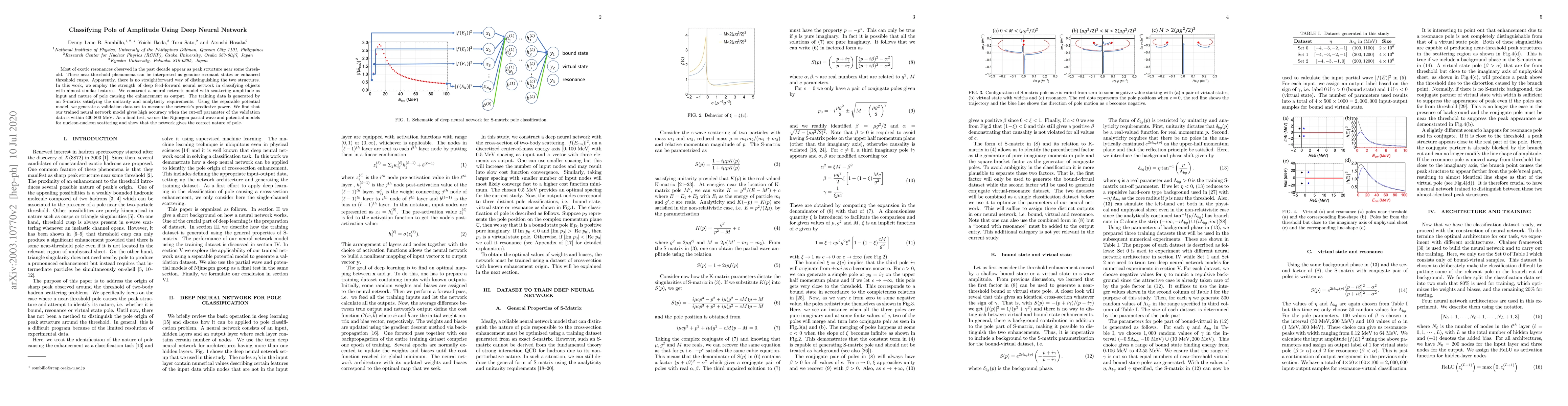 Most of exotic resonances observed in the past decade appear as peak structure near some threshold. These near-threshold phenomena can be interpreted as genuine resonant states or enhanced threshold cusps. Apparently, there is no straightforward way of distinguishing the two structures. In this work, we employ the strength of deep feed-forward neural network in classifying objects with almost similar features. We construct a neural network model with scattering amplitude as input and nature of pole causing the enhancement as output. The training data is generated by an S-matrix satisfying the unitarity and analyticity requirements. Using the separable potential model, we generate a validation data set to measure the network's predictive power. We find that our trained neural network model gives high accuracy when the cut-off parameter of the validation data is within $400$-$800\mbox{ MeV}$. As a final test, we use the Nijmegen partial wave and potential models for nucleon-nucleon scattering and show that the network gives the correct nature of pole.