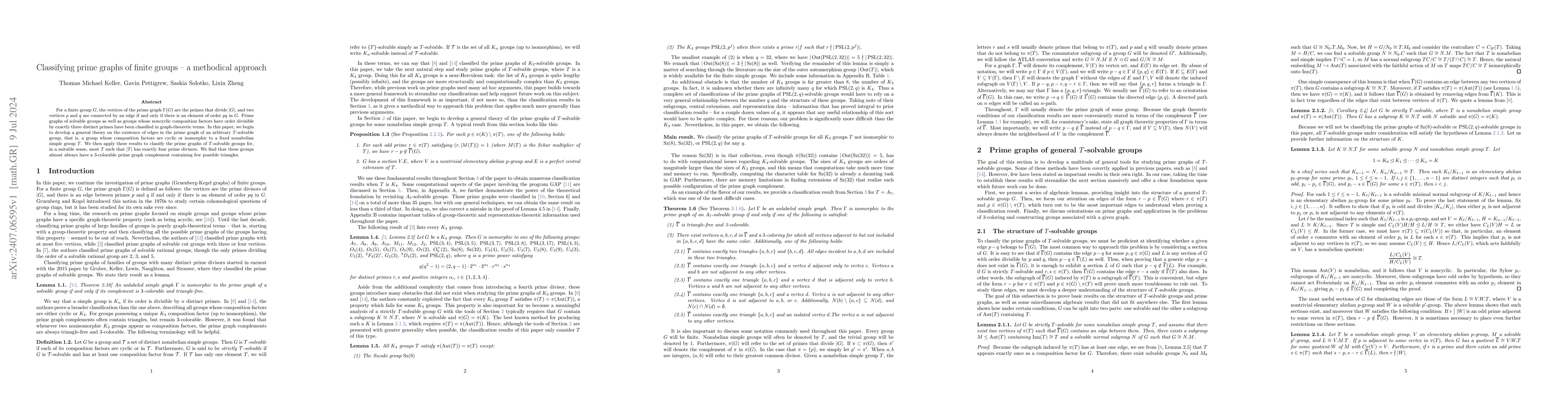 For a finite group $G$, the vertices of the prime graph $\Gamma(G)$ are the primes that divide $|G|$, and two vertices $p$ and $q$ are connected by an edge if and only if there is an element of order $pq$ in $G$. Prime graphs of solvable groups as well as groups whose noncyclic composition factors have order divisible by exactly three distinct primes have been classified in graph-theoretic terms. In this paper, we begin to develop a general theory on the existence of edges in the prime graph of an arbitrary $T$-solvable group, that is, a group whose composition factors are cyclic or isomorphic to a fixed nonabelian simple group $T$. We then apply these results to classify the prime graphs of $T$-solvable groups for, in a suitable sense, most $T$ such that $|T|$ has exactly four prime divisors. We find that these groups almost always have a 3-colorable prime graph complement containing few possible triangles.