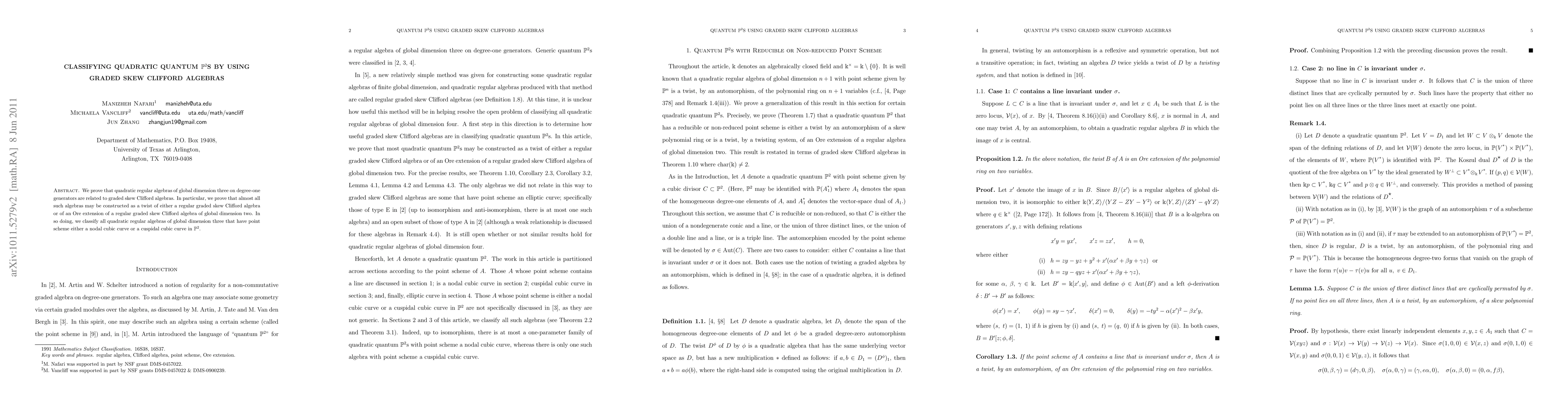 This paper demonstrates a classification method for quadratic regular algebras of global dimension three using graded skew Clifford algebras. It shows that almost all such algebras can be constructed via twists of regular graded skew Clifford algebras or their Ore extensions, leading to a classification of algebras with nodal or cuspidal cubic curves in P^2.