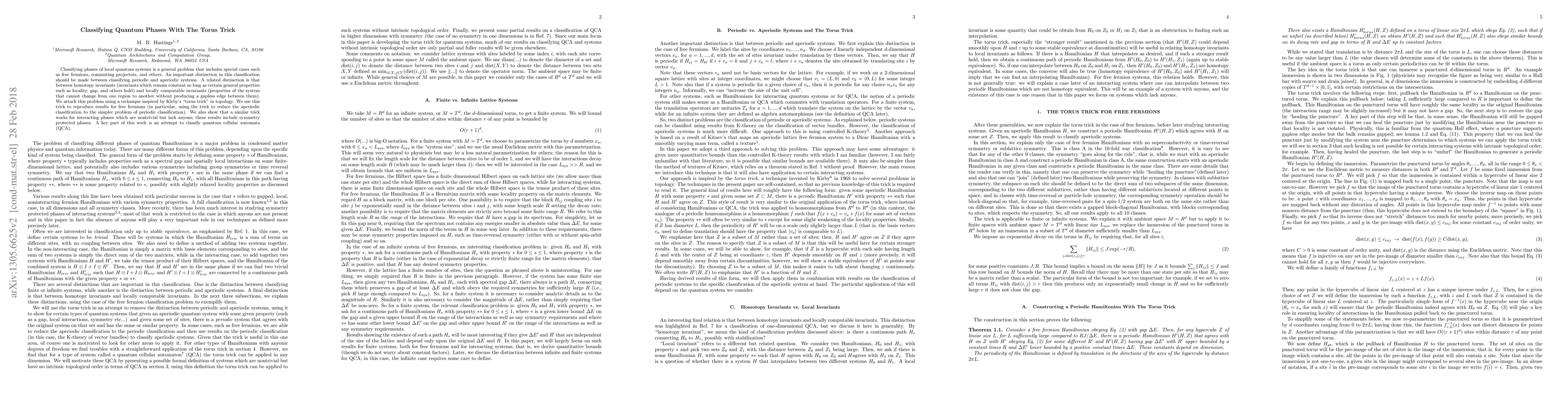 The paper introduces a topological method using the torus trick to classify quantum phases and quantum cellular automata, distinguishing between homotopy and locally computable invariants, and proposes definitions for locally generated and locally preserving unitaries.