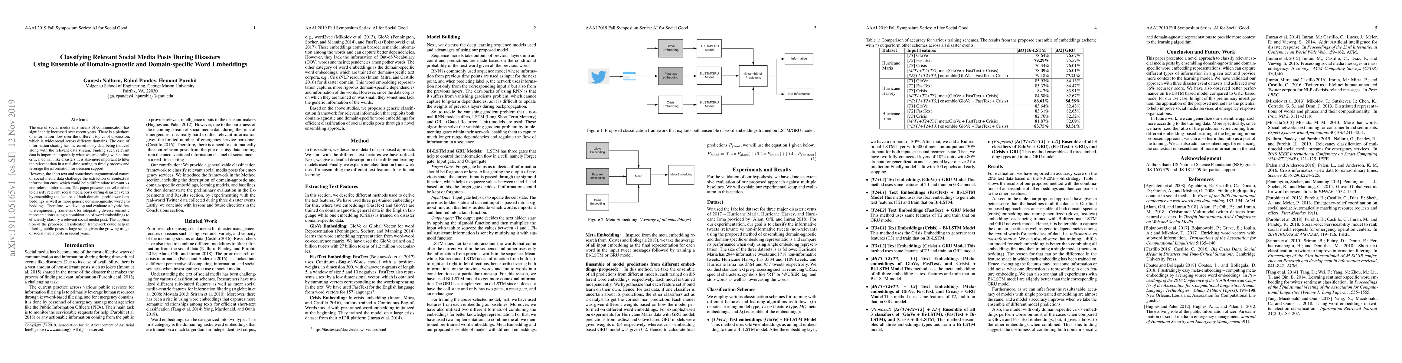This paper presents a method to classify relevant social media posts during disasters by combining domain-specific and domain-agnostic word embeddings. The proposed ensemble approach aims to efficiently filter large-scale data, leveraging diverse semantic representations to improve real-time decision support.