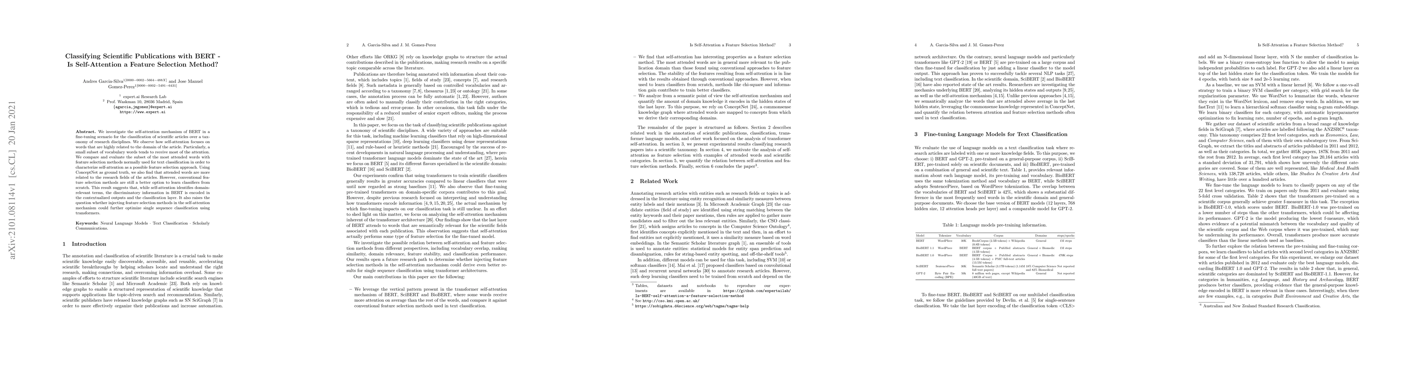 We investigate the self-attention mechanism of BERT in a fine-tuning scenario for the classification of scientific articles over a taxonomy of research disciplines. We observe how self-attention focuses on words that are highly related to the domain of the article. Particularly, a small subset of vocabulary words tends to receive most of the attention. We compare and evaluate the subset of the most attended words with feature selection methods normally used for text classification in order to characterize self-attention as a possible feature selection approach. Using ConceptNet as ground truth, we also find that attended words are more related to the research fields of the articles. However, conventional feature selection methods are still a better option to learn classifiers from scratch. This result suggests that, while self-attention identifies domain-relevant terms, the discriminatory information in BERT is encoded in the contextualized outputs and the classification layer. It also raises the question whether injecting feature selection methods in the self-attention mechanism could further optimize single sequence classification using transformers.