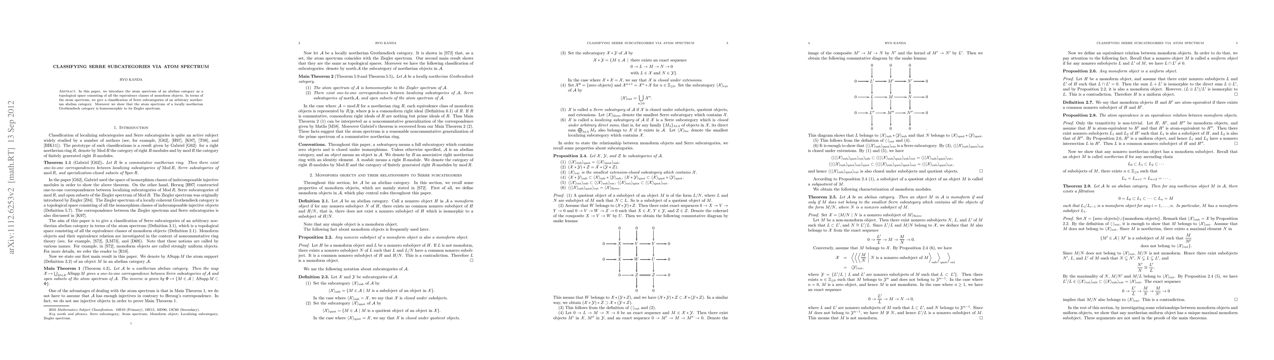 This paper introduces the atom spectrum of an abelian category, defining it as a topological space of equivalence classes of monoform objects, and uses it to classify Serre subcategories of noetherian abelian categories. It also demonstrates the homeomorphism between the atom spectrum and the Ziegler spectrum in locally noetherian Grothendieck categories.