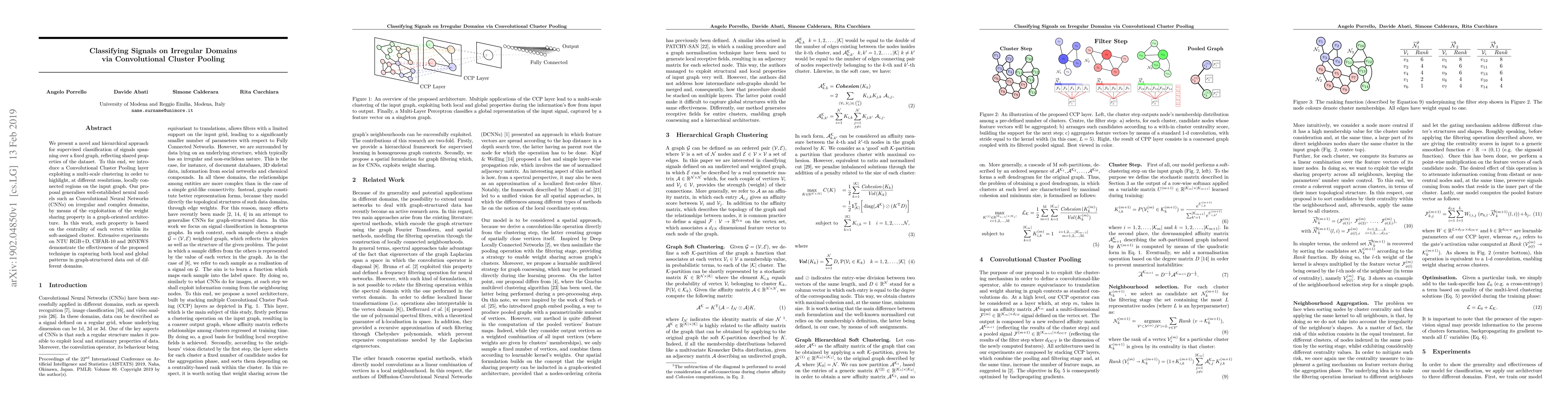 We present a novel and hierarchical approach for supervised classification of signals spanning over a fixed graph, reflecting shared properties of the dataset. To this end, we introduce a Convolutional Cluster Pooling layer exploiting a multi-scale clustering in order to highlight, at different resolutions, locally connected regions on the input graph. Our proposal generalises well-established neural models such as Convolutional Neural Networks (CNNs) on irregular and complex domains, by means of the exploitation of the weight sharing property in a graph-oriented architecture. In this work, such property is based on the centrality of each vertex within its soft-assigned cluster. Extensive experiments on NTU RGB+D, CIFAR-10 and 20NEWS demonstrate the effectiveness of the proposed technique in capturing both local and global patterns in graph-structured data out of different domains.