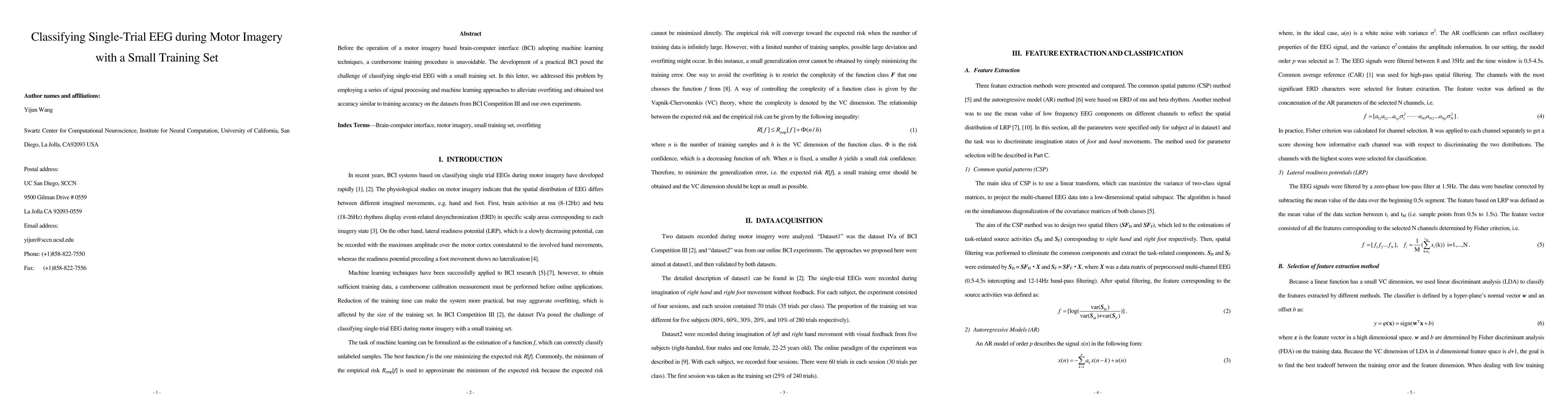 Before the operation of a motor imagery based brain-computer interface (BCI) adopting machine learning techniques, a cumbersome training procedure is unavoidable. The development of a practical BCI posed the challenge of classifying single-trial EEG with a small training set. In this letter, we addressed this problem by employing a series of signal processing and machine learning approaches to alleviate overfitting and obtained test accuracy similar to training accuracy on the datasets from BCI Competition III and our own experiments.