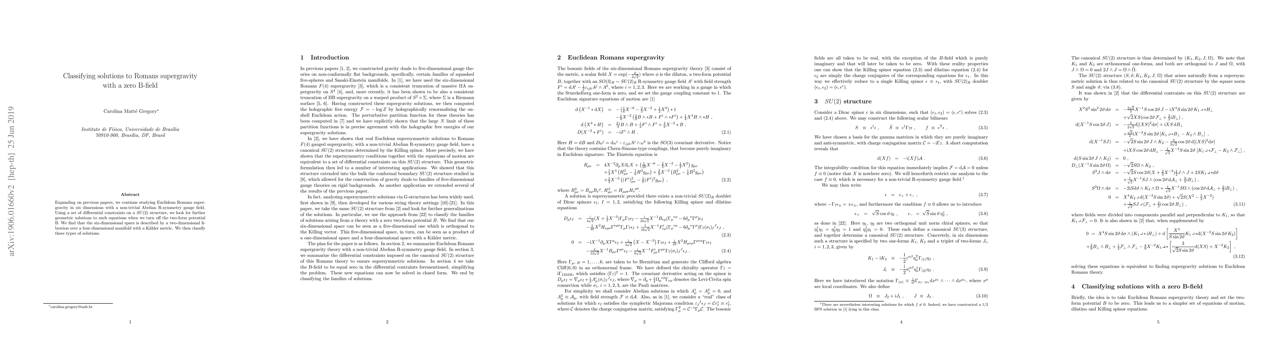 This paper explores Euclidean Romans supergravity in six dimensions with a zero B-field, focusing on solutions with a non-trivial Abelian R-symmetry gauge field. It classifies the solutions as a two-dimensional fibration over a four-dimensional Kähler manifold.