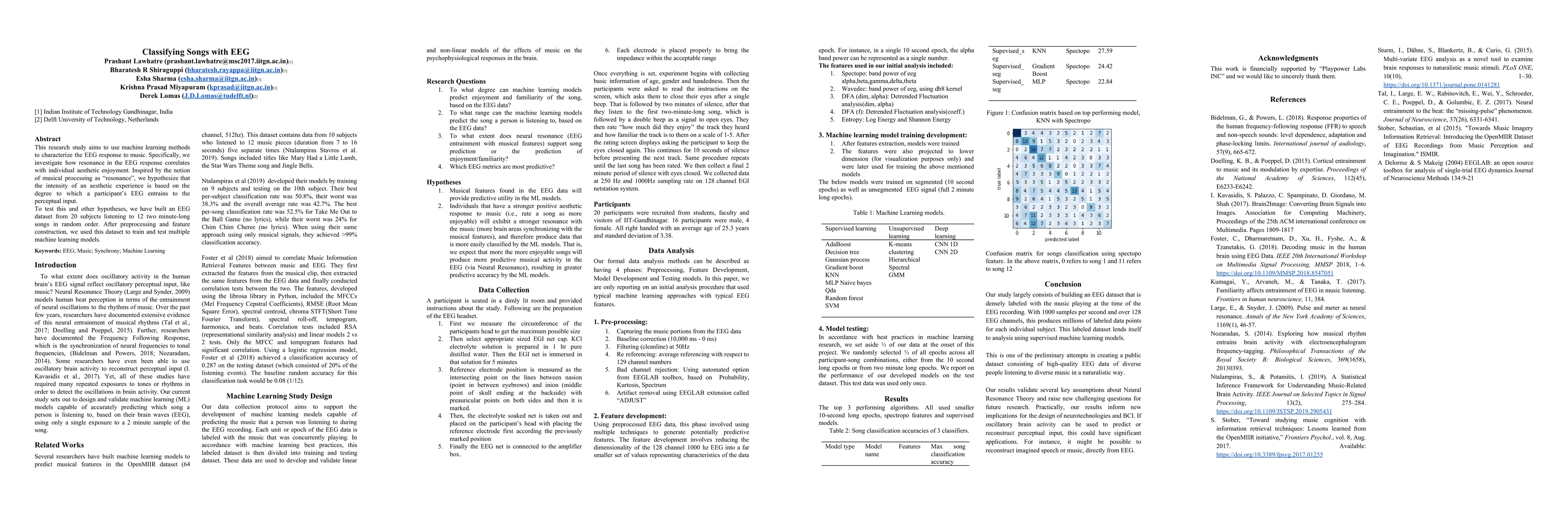Researchers used EEG to study how music affects brain waves, finding that resonance in brain activity correlates with aesthetic enjoyment of music. Machine learning models were trained on the data to classify songs based on their effect on participants' brains.