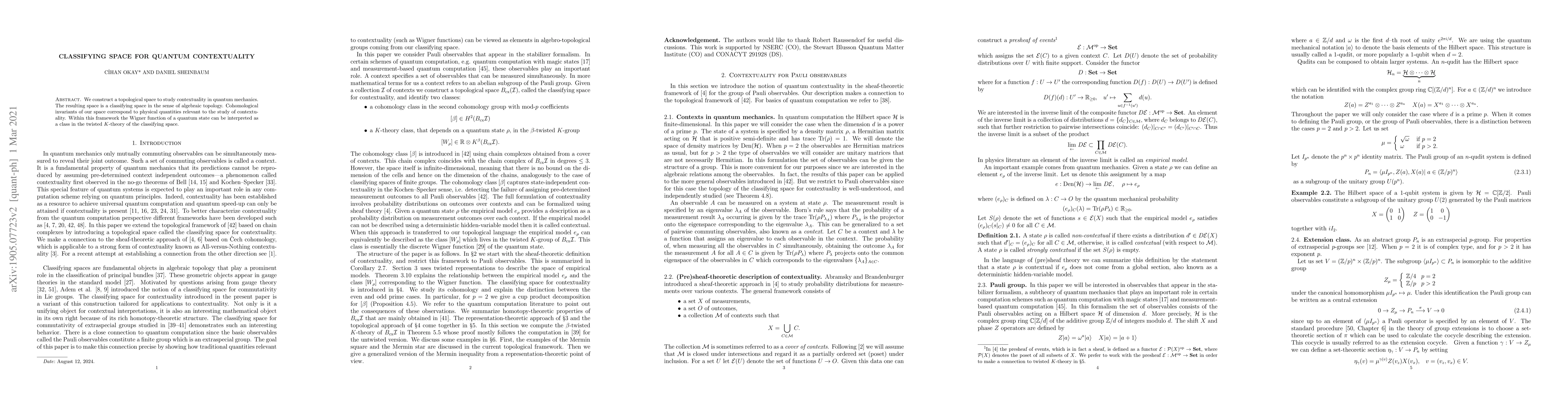 We construct a topological space to study contextuality in quantum mechanics. The resulting space is a classifying space in the sense of algebraic topology. Cohomological invariants of our space correspond to physical quantities relevant to the study of contextuality. Within this framework the Wigner function of a quantum state can be interpreted as a class in the twisted $K$-theory of the classifying space.