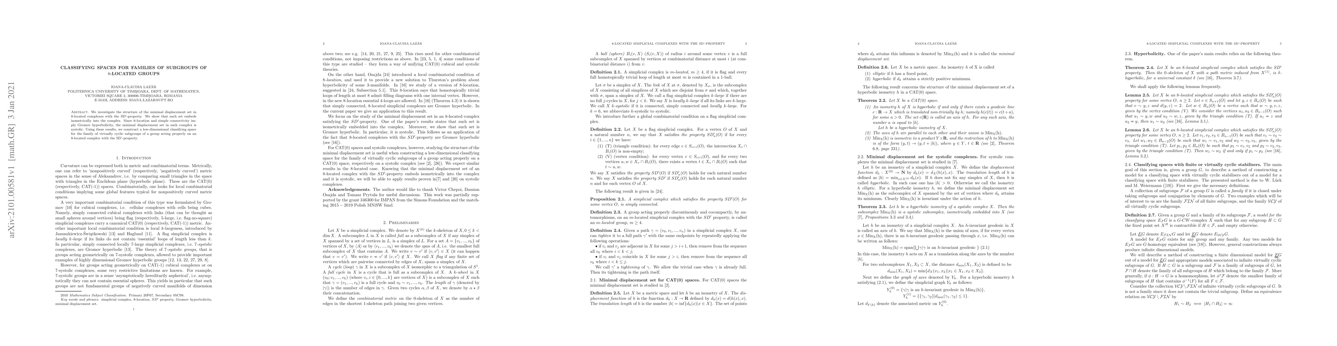 This paper explores the embedding and structure of minimal displacement sets in $8$-located complexes with the SD'-property, proving they are systolic and leading to the construction of a classifying space for virtually cyclic subgroups acting on such complexes. The results connect $8$-location, simple connectivity, and Gromov hyperbolicity.