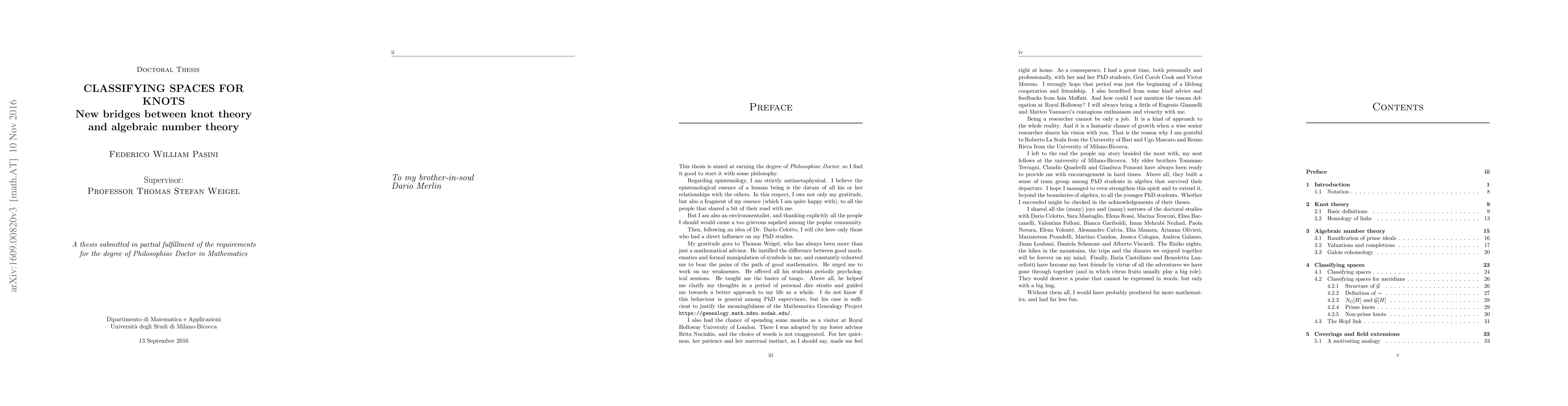 This paper explores the emergence of classifying spaces in knot theory and reveals intricate connections between knot theory and algebraic number theory. It identifies structural parallels between the fundamental group of these classifying spaces and the ideal class group, as well as a 9-term exact sequence mirroring Poitou-Tate's sequence in algebraic number fields.