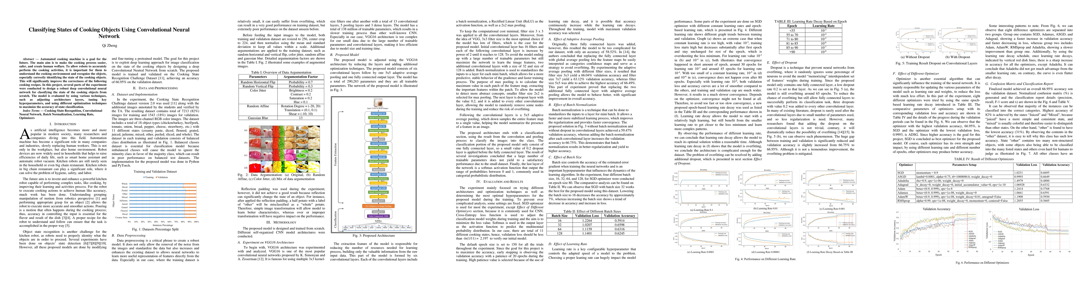 This paper develops a convolutional neural network to classify states of cooking objects for automated cooking machines, aiming to enhance cooking process safety and accuracy through improved object recognition. The model's performance is optimized by adjusting architecture layers, tuning hyperparameters, and employing various optimization techniques.