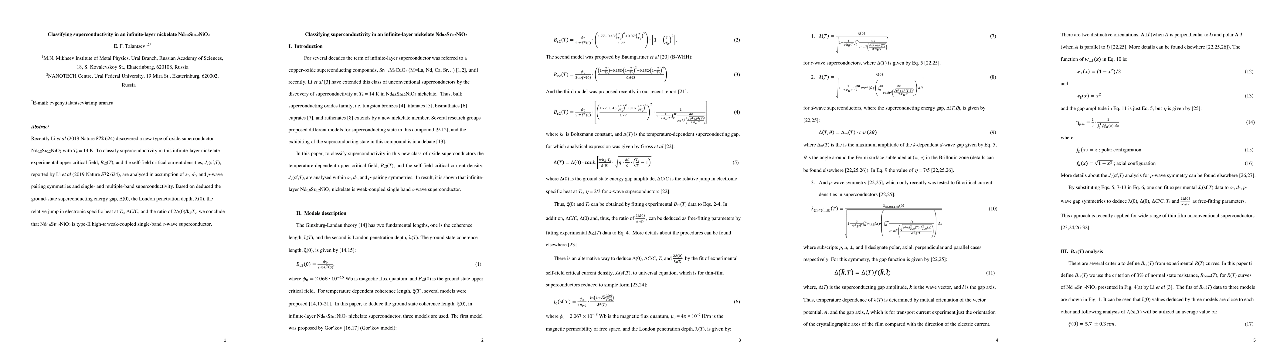 Researchers classify Nd0.8Sr0.2NiO2 as a type-II high-$eta$ weak-coupled single-band s-wave superconductor with a critical temperature of 14 K.