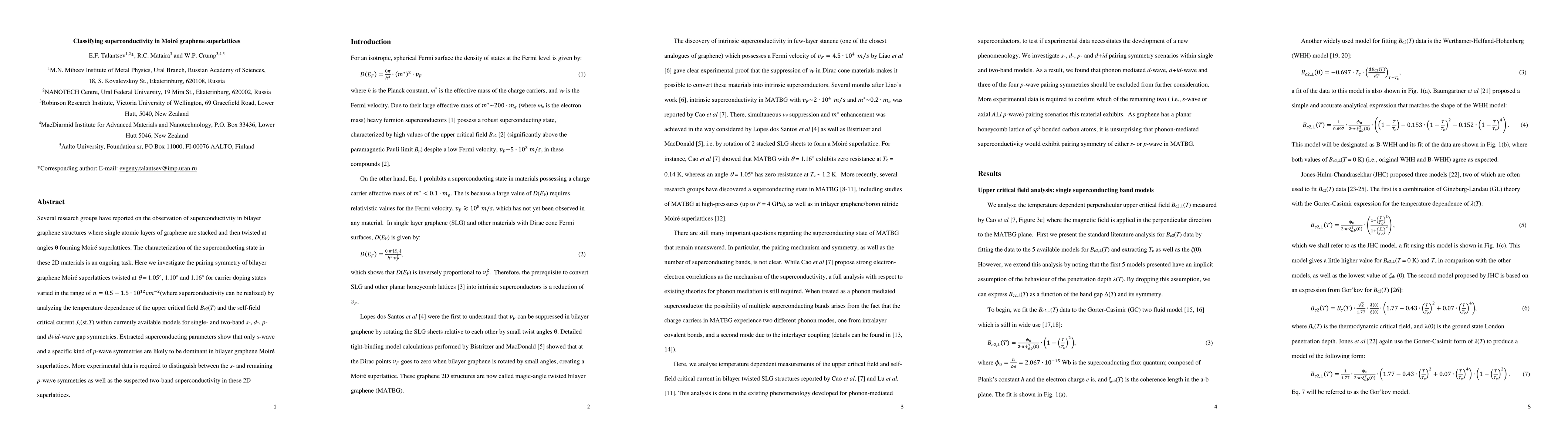 Several research groups have reported on the observation of superconductivity in bilayer graphene structures where single atomic layers of graphene are stacked and then twisted at angles $\theta$ forming Moir\'e superlattices. The characterization of the superconducting state in these 2D materials is an ongoing task. Here we investigate the pairing symmetry of bilayer graphene Moir\'e superlattices twisted at $\theta$ = 1.05{\deg}, 1.10{\deg} and 1.16{\deg} for carrier doping states varied in the range of n=0.5-1.5 10^(12) cm^(-2) (where superconductivity can be realized) by analyzing the temperature dependence of the upper critical field Bc2(T) and the self-field critical current Jc(sf,T) within currently available models for single- and two-band s-, d-, p- and d+id-wave gap symmetries. Extracted superconducting parameters show that only s-wave and a specific kind of p-wave symmetries are likely to be dominant in bilayer graphene Moir\'e superlattices. More experimental data is required to distinguish between the s- and remaining p-wave symmetries as well as the suspected two-band superconductivity in these 2D superlattices.