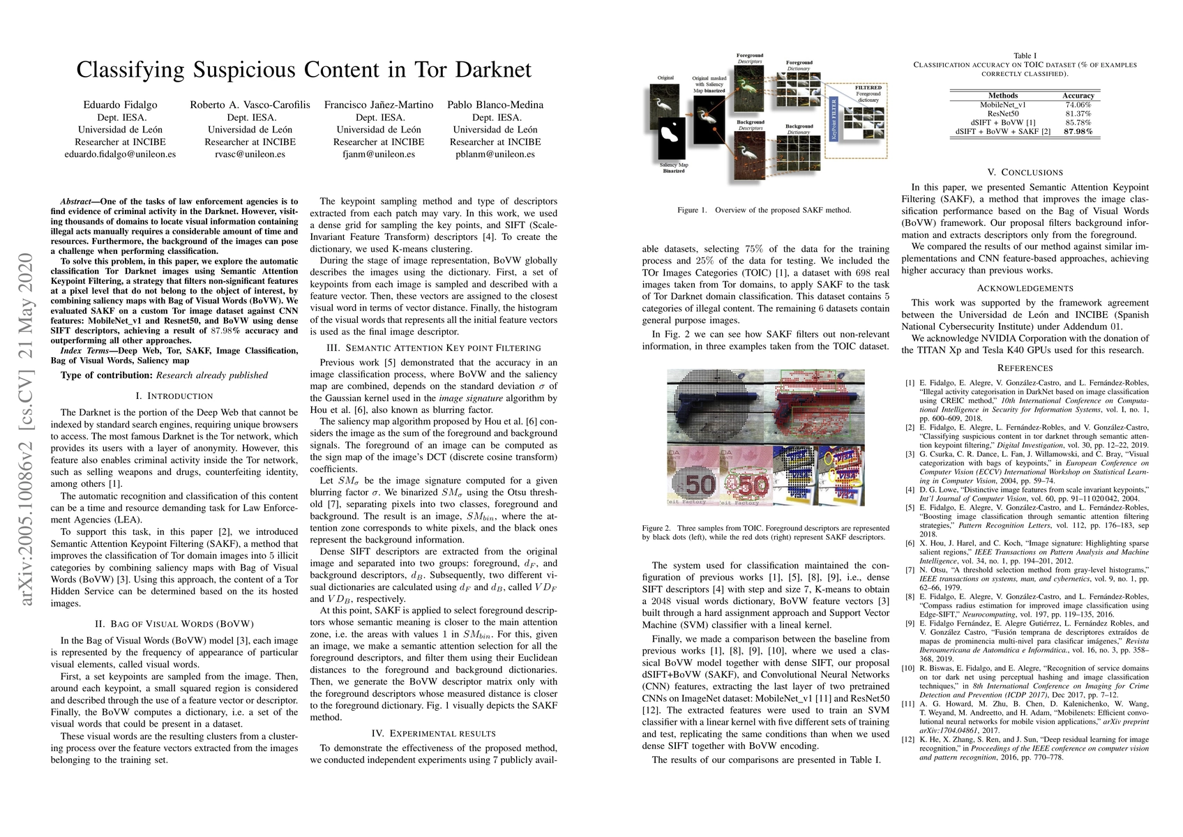 The research introduces Semantic Attention Keypoint Filtering (SAKF) for automatic classification of Tor Darknet images, combining saliency maps with Bag of Visual Words (BoVW) to filter non-significant features at a pixel level. SAKF was evaluated on a custom Tor image dataset against CNN features (MobileNet v1, Resnet50) and BoVW using dense SIFT descriptors.