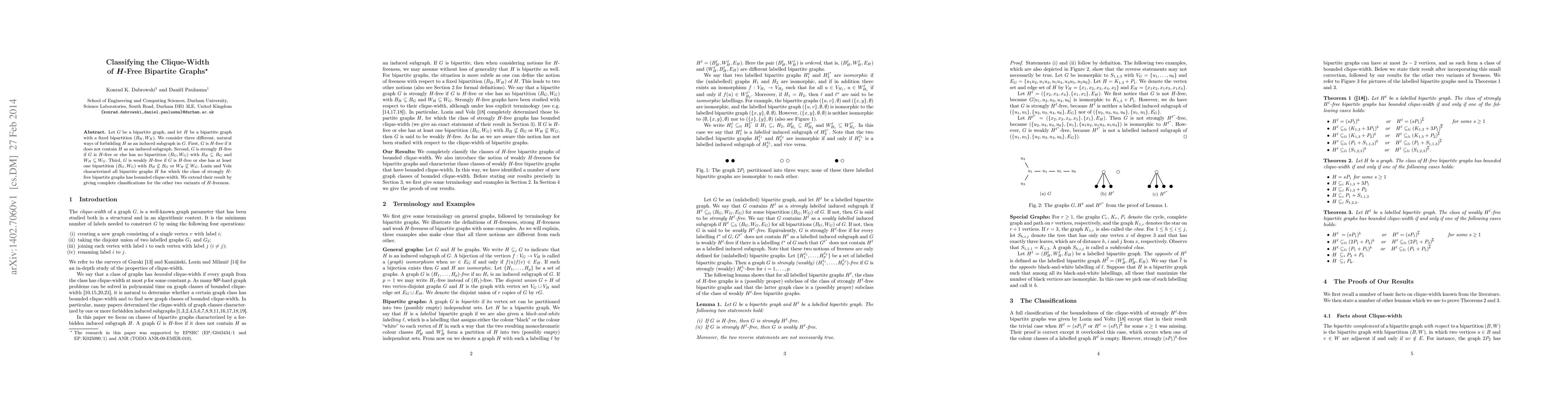 The paper classifies the clique-width of bipartite graphs that avoid specific bipartite subgraphs $H$ in three ways: as $H$-free, strongly $H$-free, and weakly $H$-free. It extends previous results on strongly $H$-free graphs to provide complete classifications for the other two variants.