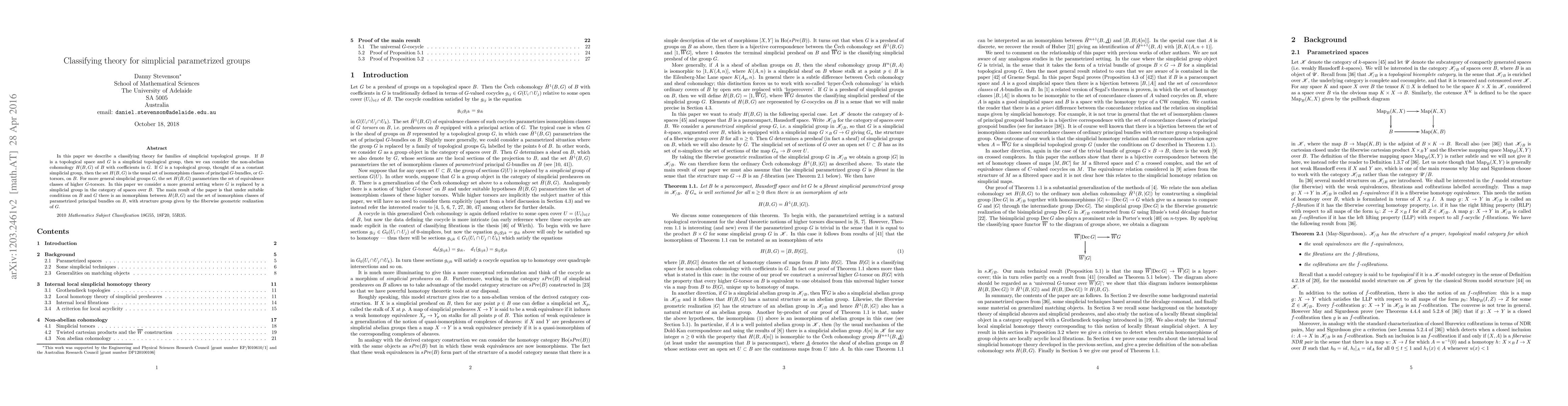This paper develops a classifying theory for simplicial parametrized groups, showing that under suitable conditions on the base space $B$ and the simplicial group $G$, the non-abelian cohomology $H(B,G)$ is isomorphic to the set of isomorphism classes of fiberwise principal bundles on $B$ with structure group given by the geometric realization of $G$.