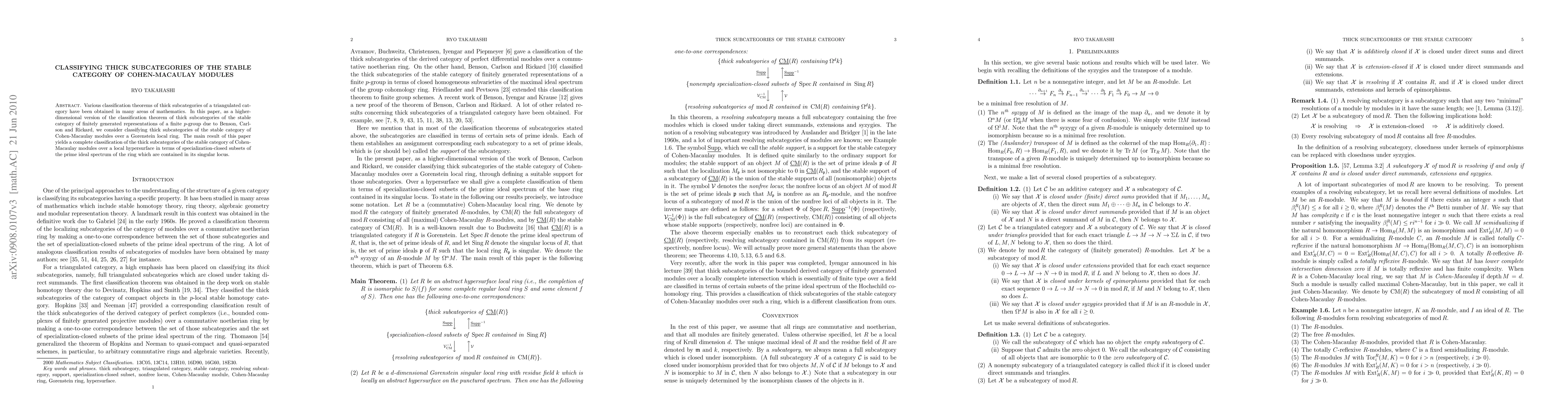 This paper classifies thick subcategories in the stable category of Cohen-Macaulay modules over a Gorenstein local ring, extending previous classification results for finitely generated representations of $p$-groups. The main result links these subcategories to specialization-closed subsets of the prime ideal spectrum contained within the singular locus of the ring.