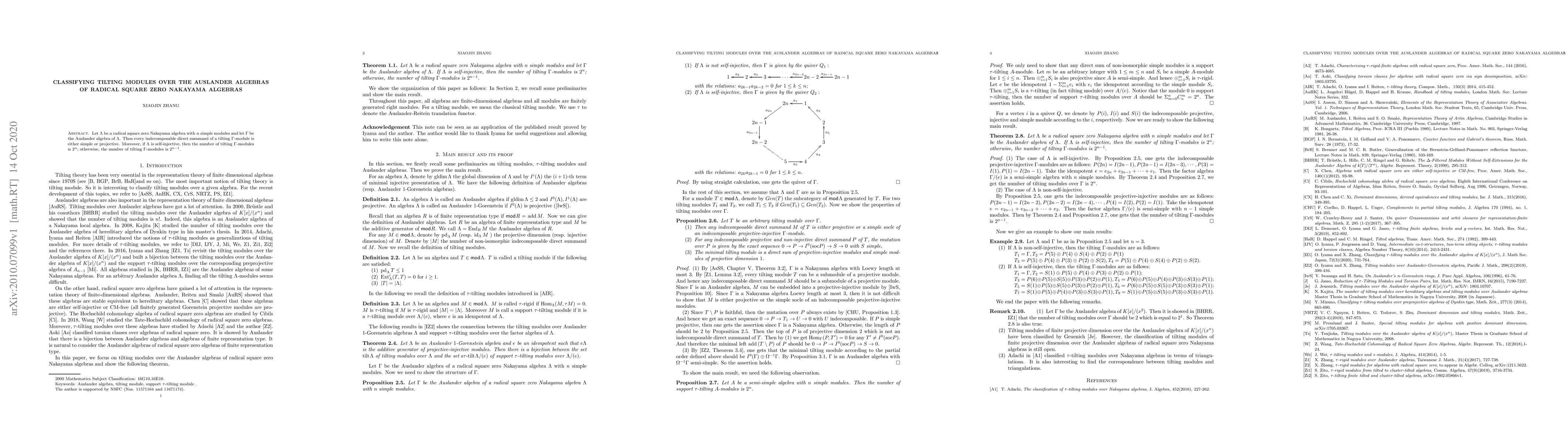 Summary: This paper classifies tilting modules over Auslander algebras of radical square zero Nakayama algebras, showing that their indecomposable summands are either simple or projective. It also determines the count of such tilting modules based on whether the original algebra is self-injective.
