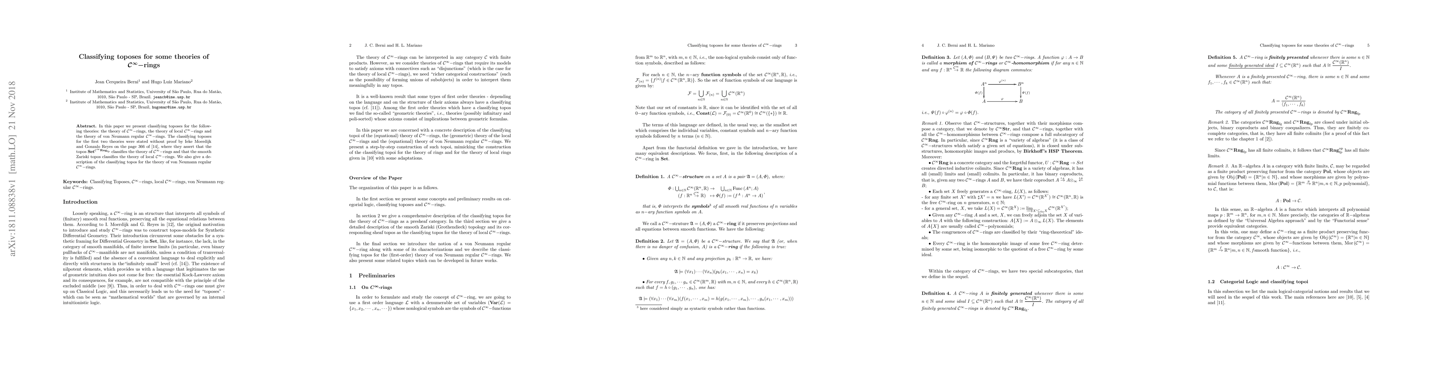 In this paper we present classifying toposes for the following theories: the theory of $\mathcal{C}^{\infty}-$rings, the theory of local $\mathcal{C}^{\infty}-$rings and the theory of von Neumann regular $\mathcal{C}^{\infty}-$rings. The classifying toposes for the first two theories were stated without proof by Ieke Moerdijk and Gonzalo Reyes on the page 366 of \cite{MSIA}, where they assert that the topos ${\rm \bf Set}^{\mathcal{C}^{\infty}{\rm \bf Rng}_{\rm fp}}$ classifies the theory of $\mathcal{C}^{\infty}-$rings and that the smooth Zariski topos classifies the theory of local $\mathcal{C}^{\infty}-$rings.