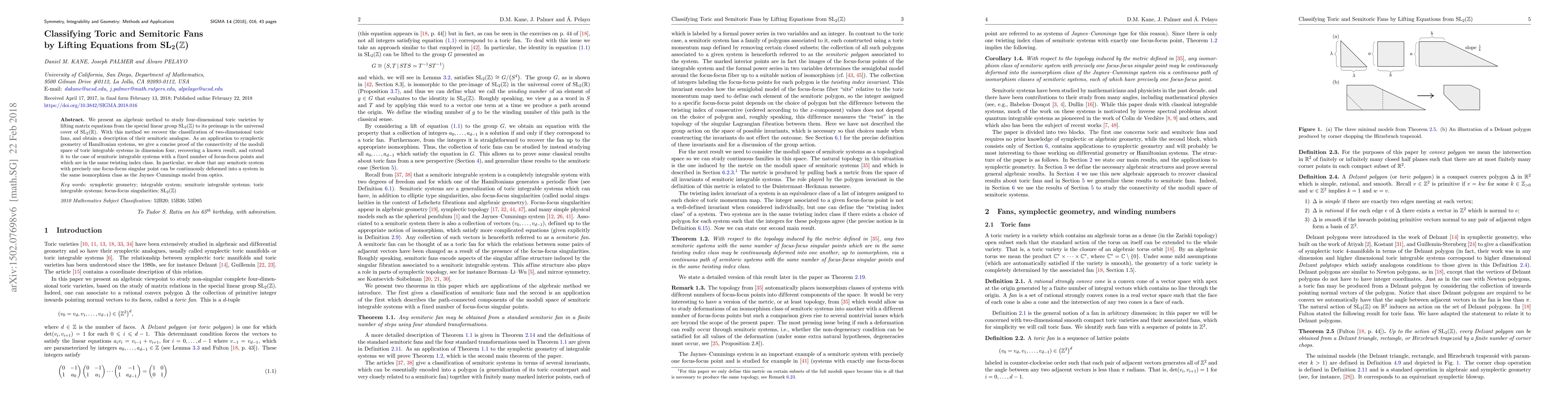 We present an algebraic method to study four-dimensional toric varieties by lifting matrix equations from the special linear group ${\rm SL}_2({\mathbb Z})$ to its preimage in the universal cover of ${\rm SL}_2({\mathbb R})$. With this method we recover the classification of two-dimensional toric fans, and obtain a description of their semitoric analogue. As an application to symplectic geometry of Hamiltonian systems, we give a concise proof of the connectivity of the moduli space of toric integrable systems in dimension four, recovering a known result, and extend it to the case of semitoric integrable systems with a fixed number of focus-focus points and which are in the same twisting index class. In particular, we show that any semitoric system with precisely one focus-focus singular point can be continuously deformed into a system in the same isomorphism class as the Jaynes-Cummings model from optics.