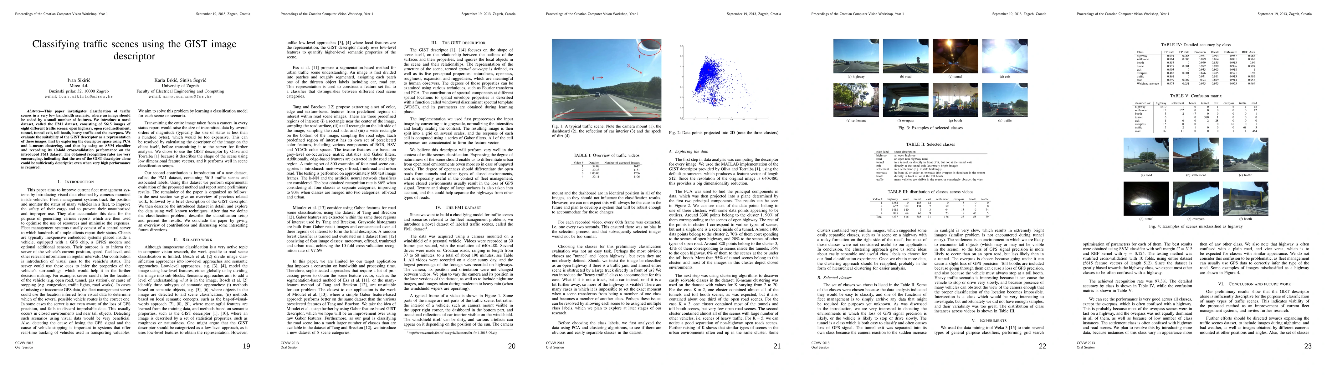 This paper presents a novel FM1 dataset of 5615 traffic scene images and evaluates the GIST descriptor's effectiveness for classifying these scenes, achieving promising results with an SVM classifier, suggesting GIST's potential in low-bandwidth scenarios.