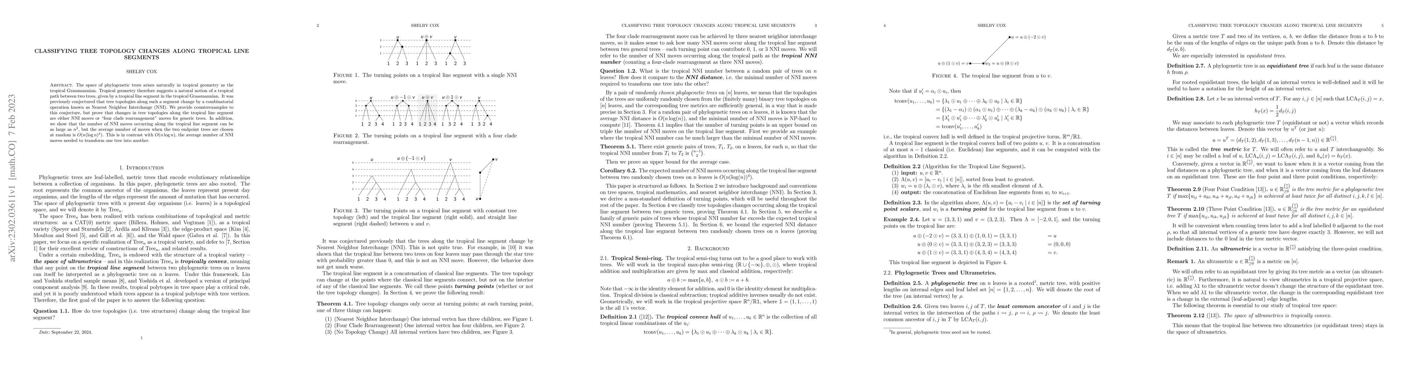 This paper refutes the conjecture that tree topologies change exclusively via Nearest Neighbor Interchange (NNI) along tropical line segments in tropical Grassmannian, proving instead that changes can also involve "four clade rearrangement" moves. It also shows that while NNI moves can theoretically reach $n^2$, the average number of NNI moves for randomly chosen trees is $O(n (\log n)^4)$.