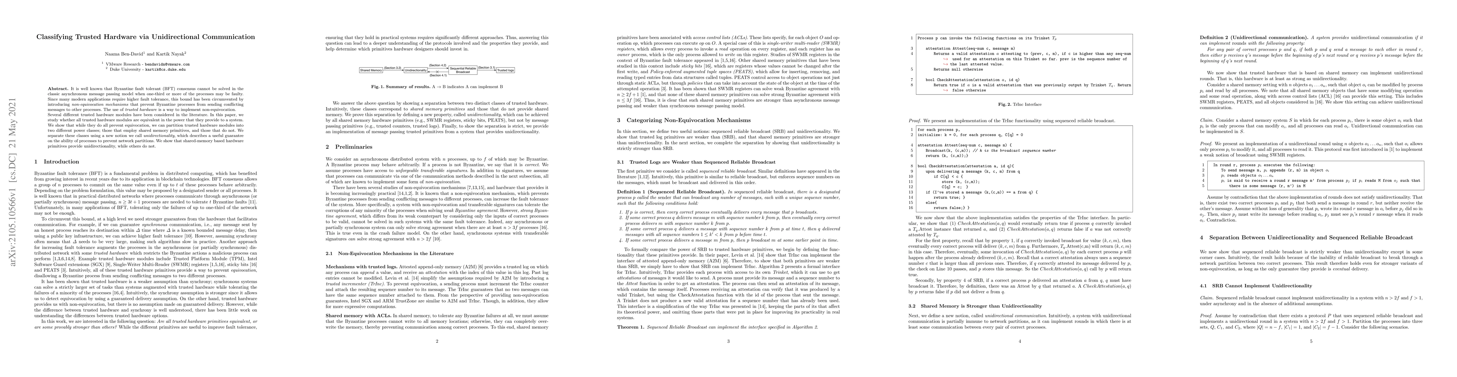 Researchers classify trusted hardware modules into two classes based on their unidirectionality, a new concept that guarantees process prevention of network partitions. This classification helps evaluate the power provided by different types of trusted hardware in achieving fault tolerance.