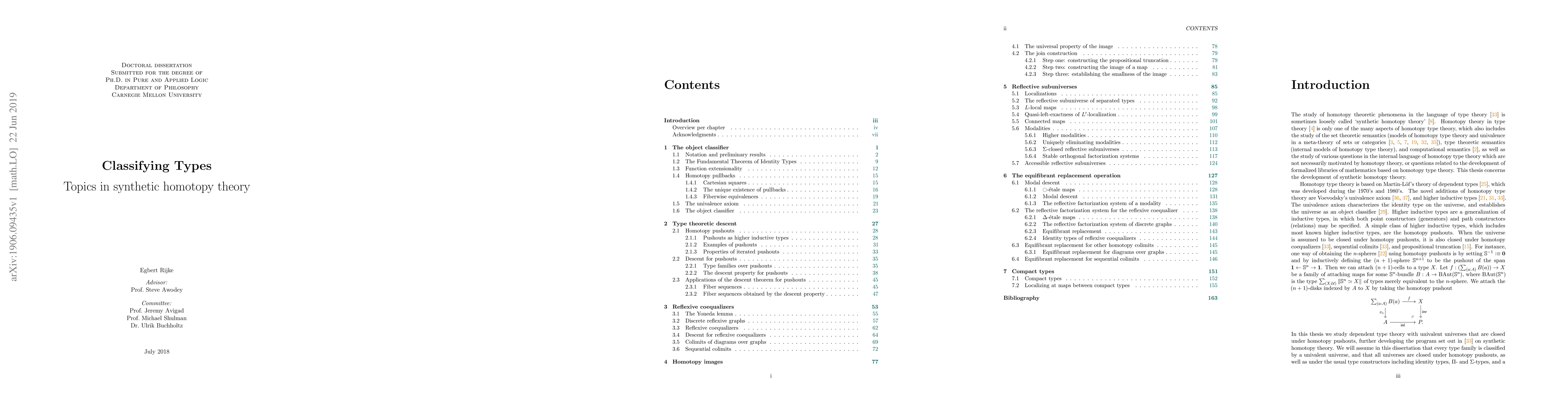 The study of homotopy theoretic phenomena in the language of type theory is sometimes loosely called `synthetic homotopy theory'. Homotopy theory in type theory is only one of the many aspects of homotopy type theory, which also includes the study of the set theoretic semantics (models of homotopy type theory and univalence in a meta-theory of sets or categories), type theoretic semantics (internal models of homotopy type theory), and computational semantics, as well as the study of various questions in the internal language of homotopy type theory which are not necessarily motivated by homotopy theory, or questions related to the development of formalized libraries of mathematics based on homotopy type theory. This thesis concerns the development of synthetic homotopy theory.