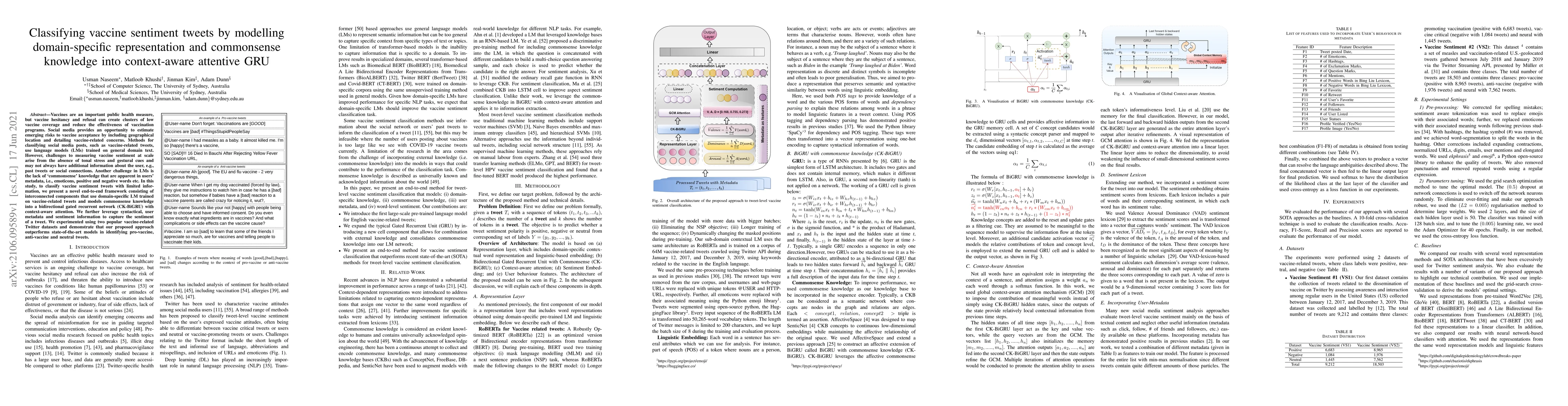 Vaccines are an important public health measure, but vaccine hesitancy and refusal can create clusters of low vaccine coverage and reduce the effectiveness of vaccination programs. Social media provides an opportunity to estimate emerging risks to vaccine acceptance by including geographical location and detailing vaccine-related concerns. Methods for classifying social media posts, such as vaccine-related tweets, use language models (LMs) trained on general domain text. However, challenges to measuring vaccine sentiment at scale arise from the absence of tonal stress and gestural cues and may not always have additional information about the user, e.g., past tweets or social connections. Another challenge in LMs is the lack of commonsense knowledge that are apparent in users metadata, i.e., emoticons, positive and negative words etc. In this study, to classify vaccine sentiment tweets with limited information, we present a novel end-to-end framework consisting of interconnected components that use domain-specific LM trained on vaccine-related tweets and models commonsense knowledge into a bidirectional gated recurrent network (CK-BiGRU) with context-aware attention. We further leverage syntactical, user metadata and sentiment information to capture the sentiment of a tweet. We experimented using two popular vaccine-related Twitter datasets and demonstrate that our proposed approach outperforms state-of-the-art models in identifying pro-vaccine, anti-vaccine and neutral tweets.