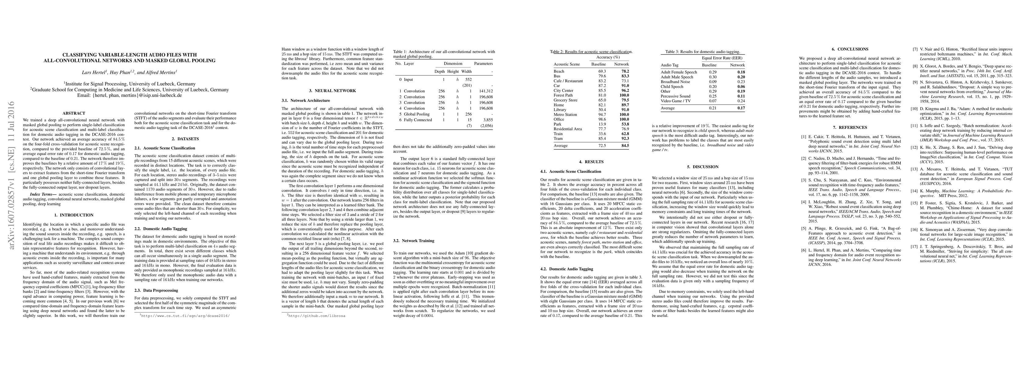 We trained a deep all-convolutional neural network with masked global pooling to perform single-label classification for acoustic scene classification and multi-label classification for domestic audio tagging in the DCASE-2016 contest. Our network achieved an average accuracy of 84.5% on the four-fold cross-validation for acoustic scene recognition, compared to the provided baseline of 72.5%, and an average equal error rate of 0.17 for domestic audio tagging, compared to the baseline of 0.21. The network therefore improves the baselines by a relative amount of 17% and 19%, respectively. The network only consists of convolutional layers to extract features from the short-time Fourier transform and one global pooling layer to combine those features. It particularly possesses neither fully-connected layers, besides the fully-connected output layer, nor dropout layers.