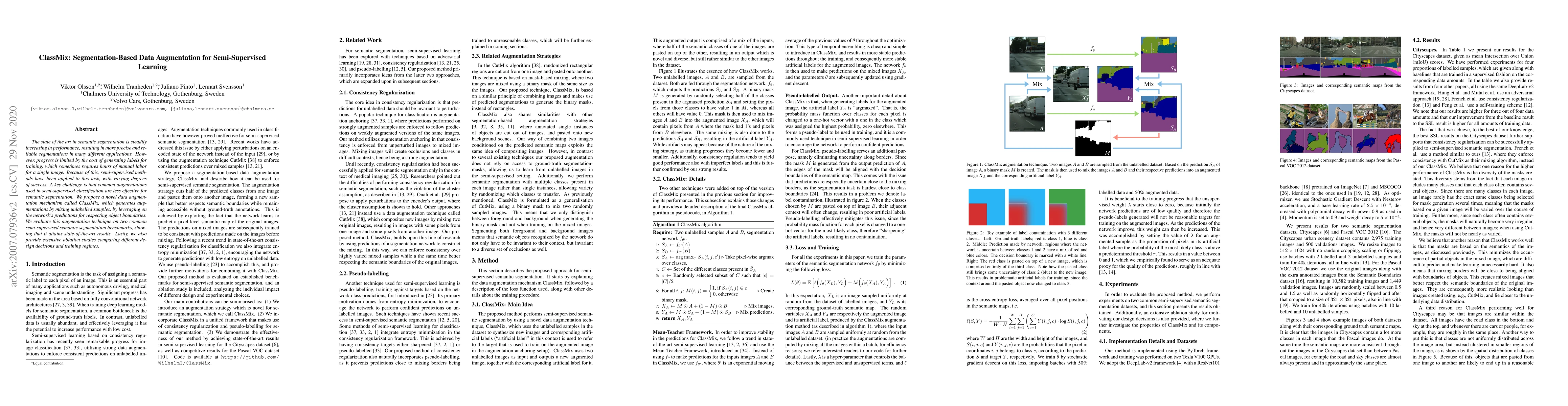 ClassMix introduces a novel data augmentation strategy for semi-supervised semantic segmentation, which mixes unlabeled samples while respecting object boundaries through network predictions. It achieves state-of-the-art results on two benchmarks and includes detailed ablation studies to analyze design choices.