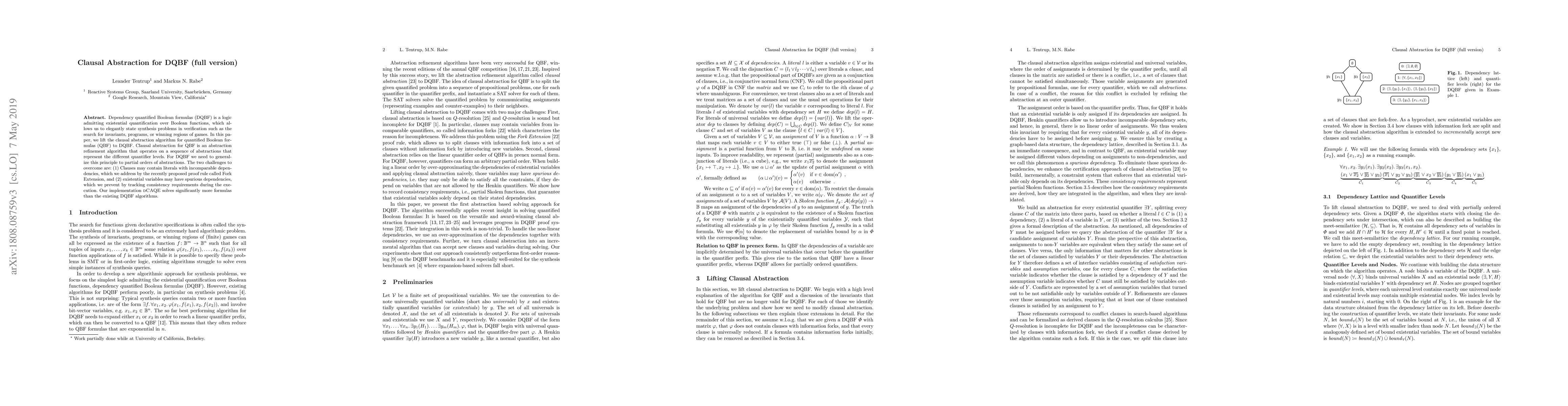 This paper extends clausal abstraction, an abstraction refinement algorithm for quantified Boolean formulas (QBF), to dependency quantified Boolean formulas (DQBF). The authors address challenges like incomparable dependencies and spurious existential variable dependencies, achieving better performance with the dCAQE implementation.