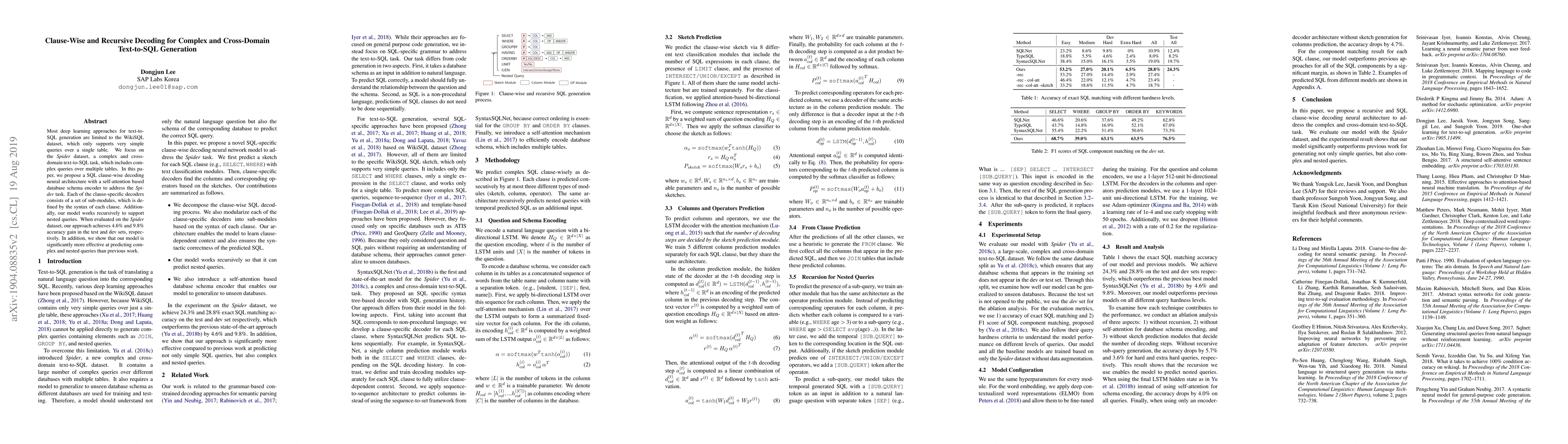 This paper proposes a clause-wise decoding neural architecture with recursive processing for complex text-to-SQL generation using the Spider dataset. The model achieves notable improvements in accuracy over previous methods, especially for complex and nested queries.