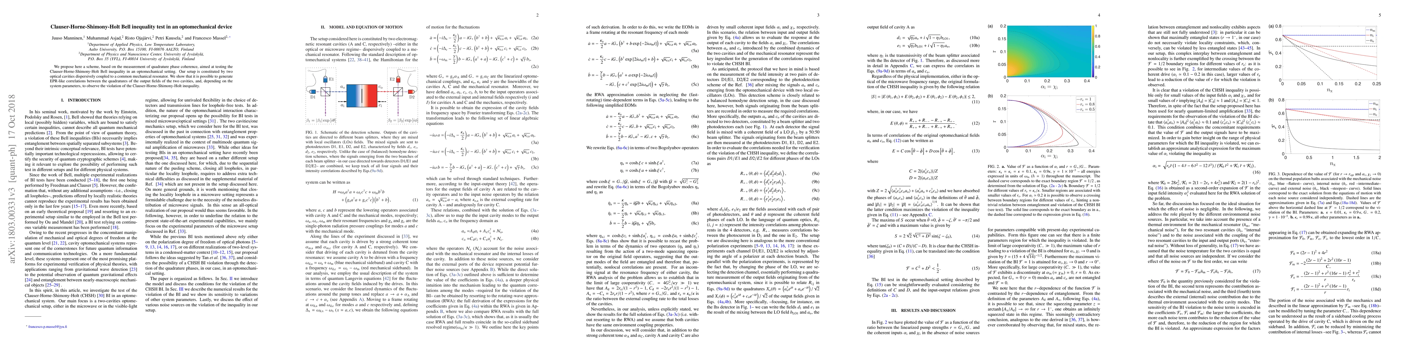 This research proposes a method to test the Clauser-Horne-Shimony-Holt Bell inequality using an optomechanical setup with two optical cavities coupled to a mechanical resonator, demonstrating the potential for generating EPR-like correlations and observing inequality violations.